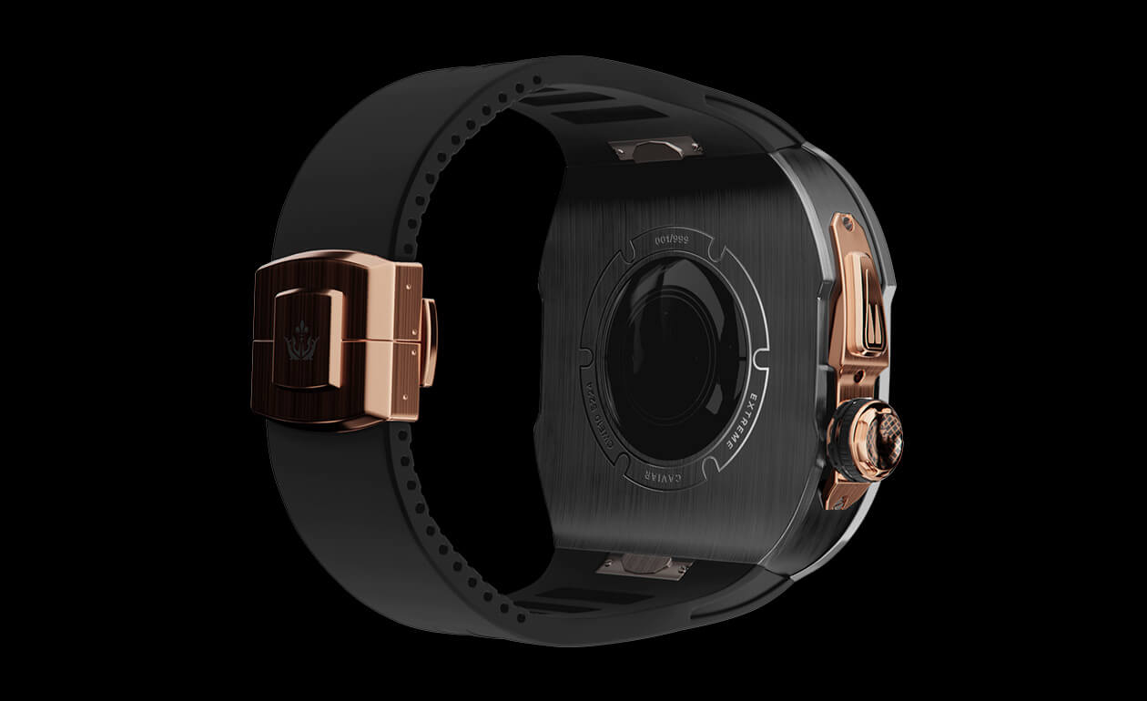 Bezel: The main body of the case is made from automotive carbon fiber, used in the creation of next-generation racing supercars. The side inserts are crafted from impact-resistant titanium with a classic rose gold PVD coating, reminiscent of the finest Swiss watches.