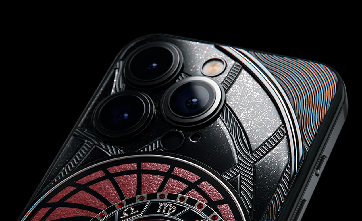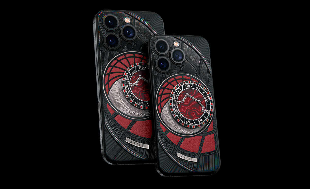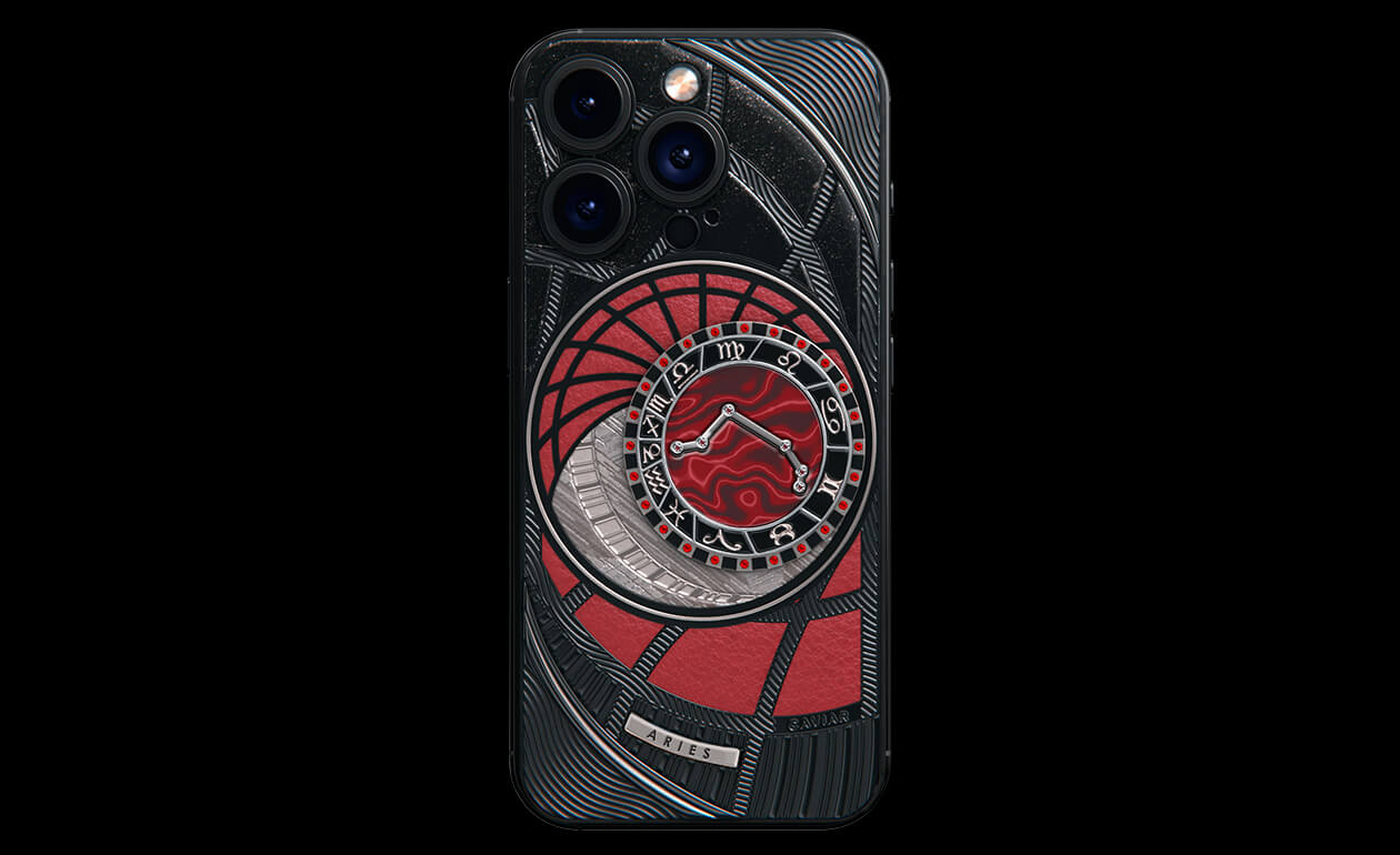 Arieses, today we present to you Aries. Your smartphone has a sky vault with your lucky stars on it. This is a panel of 24 rubies, created on black titanium with a PVD coating. We emphasized the glow of the ruby placer with a plate of red composite and finished the composition with a fragment of a meteorite on calfskin in a bright carmine shade.