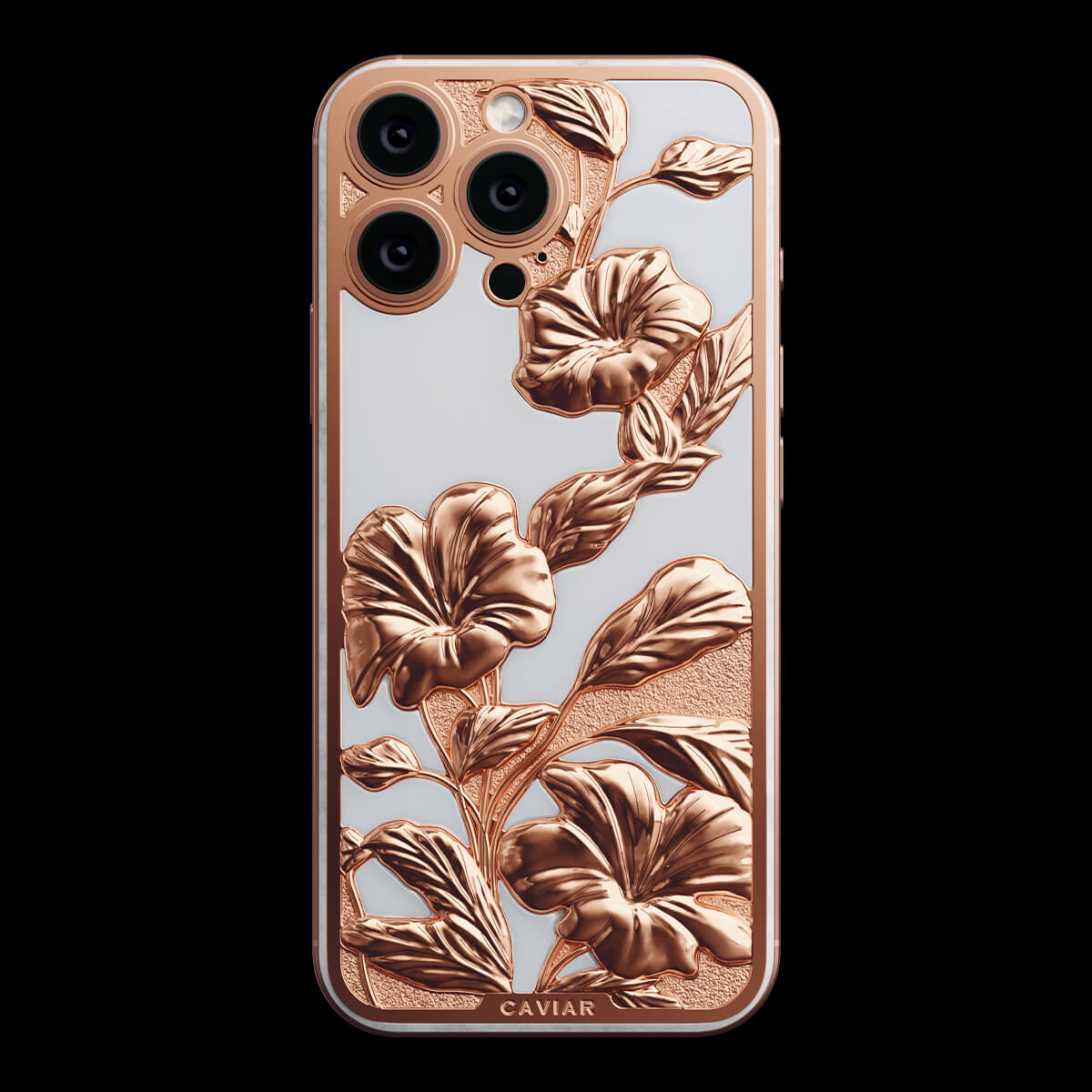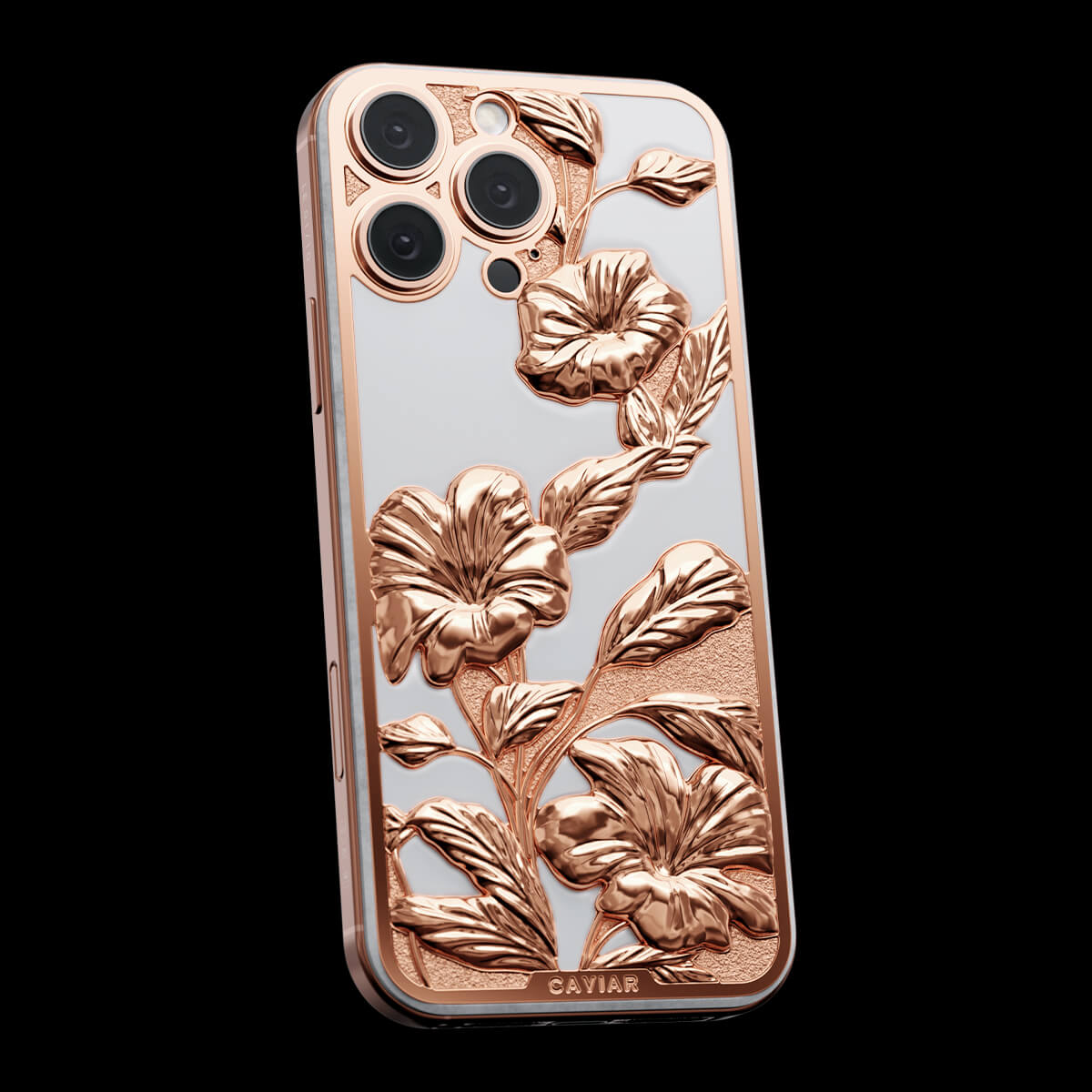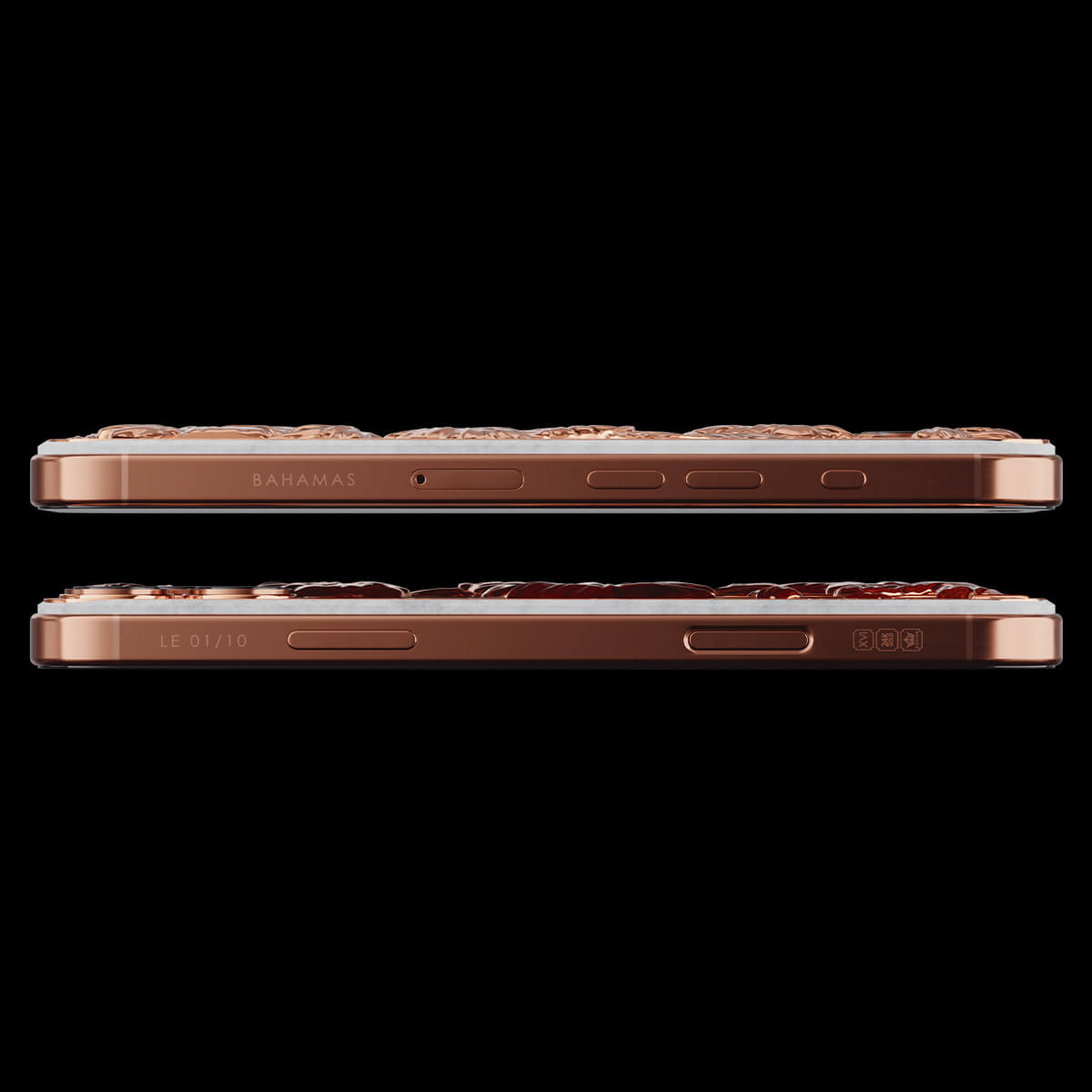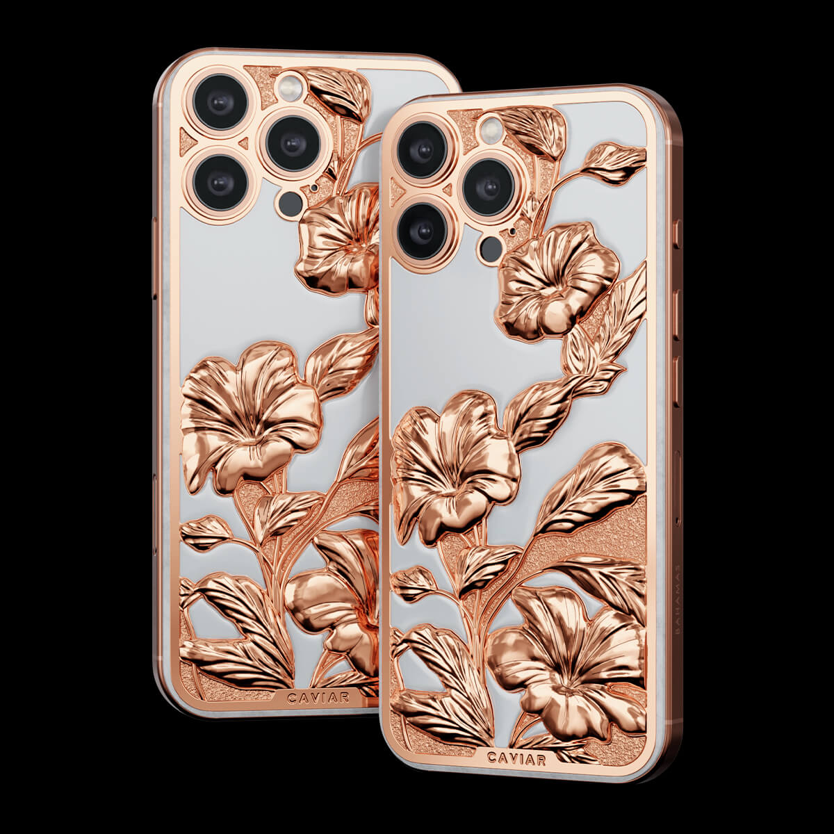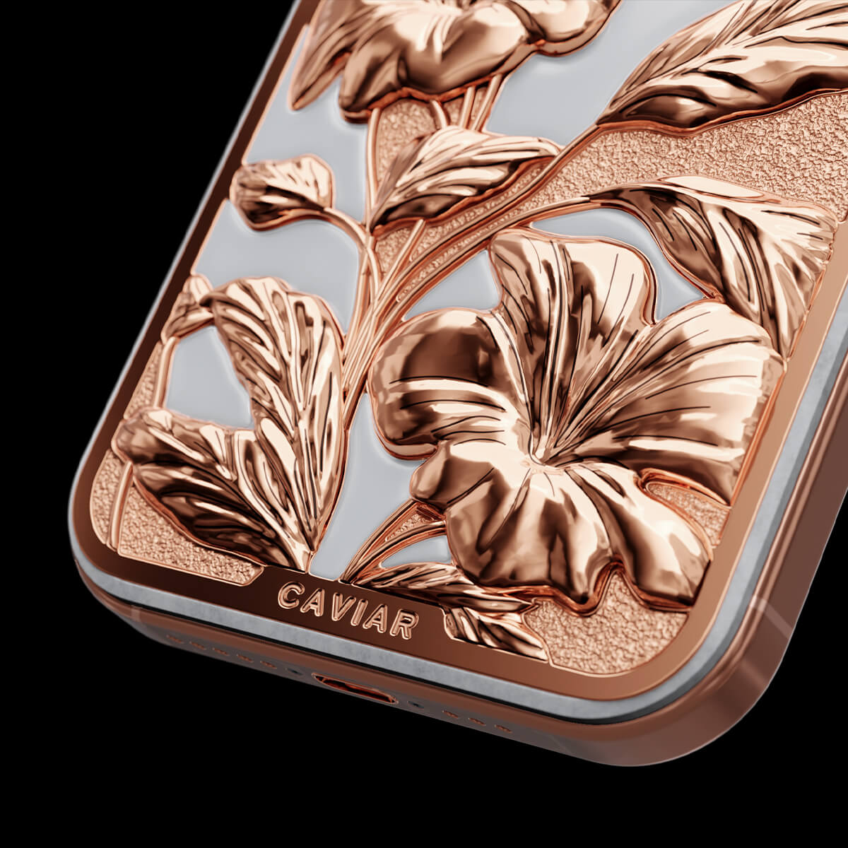 Caviar embodied the beauty of this tropical paradise in the design of a custom iPhone. The device's snow-white background is made from stone, resembling the sandy shores of the islands, while delicate floral patterns capture the fullness of the tropical flora. The pink gold framing adds warmth, echoing the sunsets reflected in the water.
