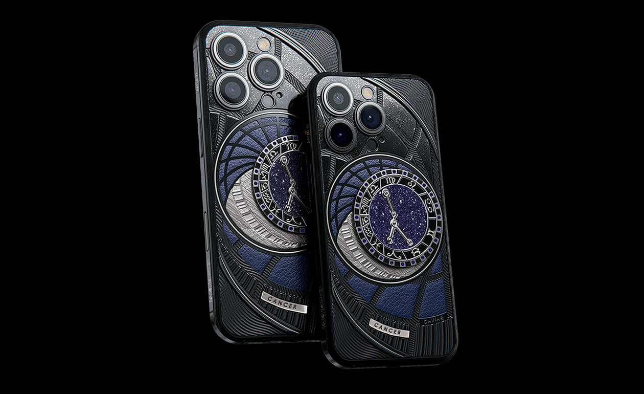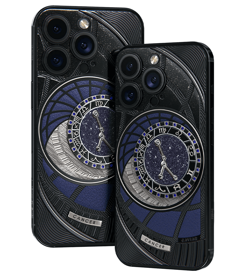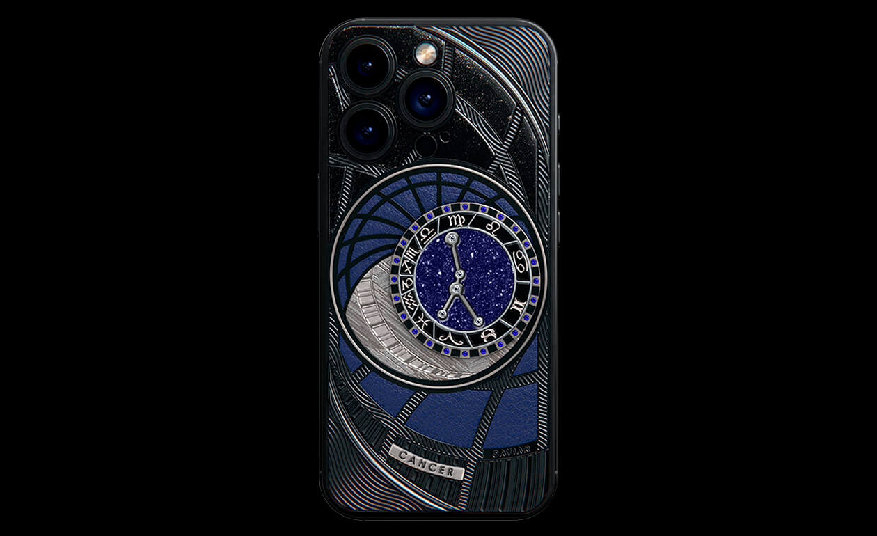 Your smartphone has a sky vault with your stars on it. This is a panel of 24 sapphires, created on black titanium with a PVD coating. We emphasized the shine of the sapphire placer with an blue composite plate and finished the composition with a fragment of a meteorite on calfskin in a bright shade of indigo.