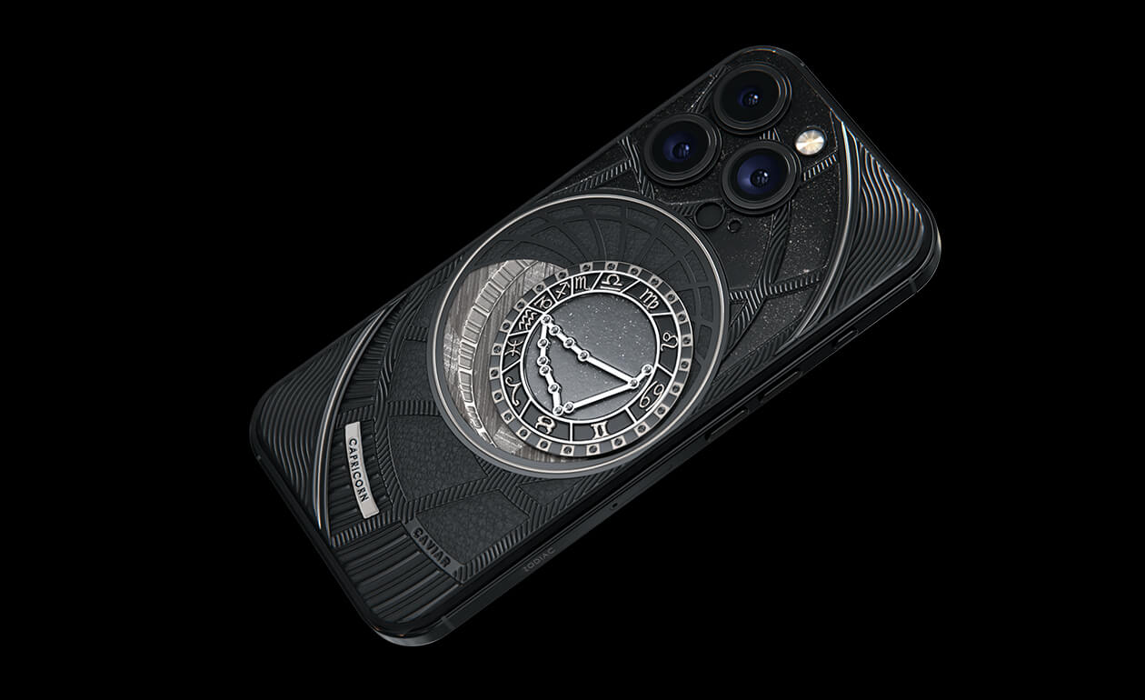 Capricorns, today we present to you Capricorn. Your smartphone has a sky vault with your stars on it. This is a panel of 24 black zirconia, created on titanium with a PVD coating. We highlighted the shine of the black diamond plaque with an black composite and finished the composition with a meteorite fragment on classic black calf leather.