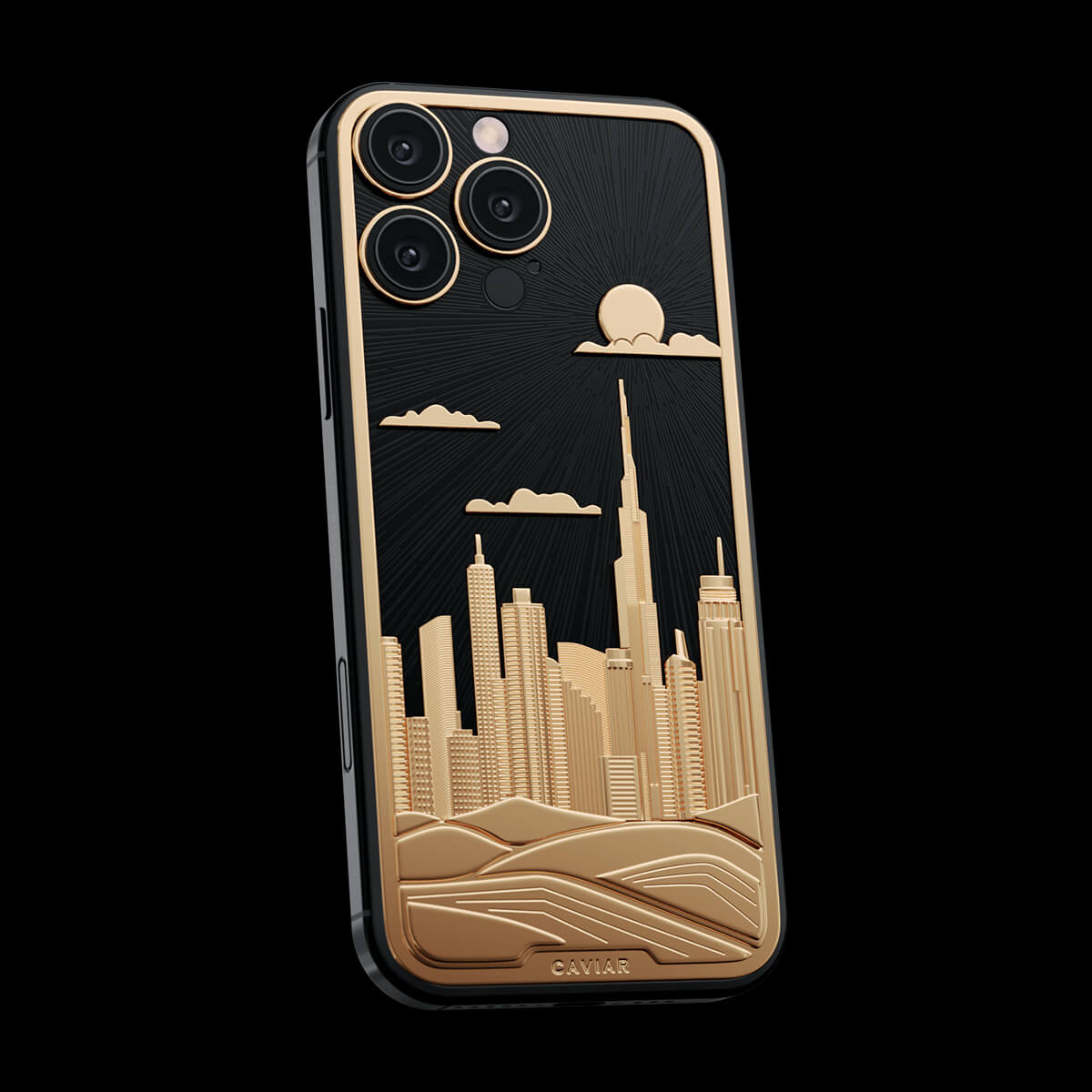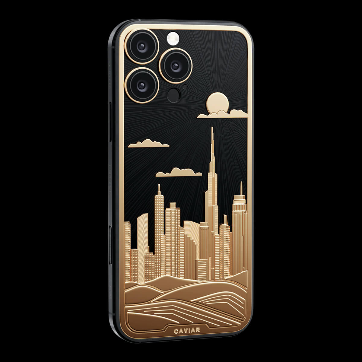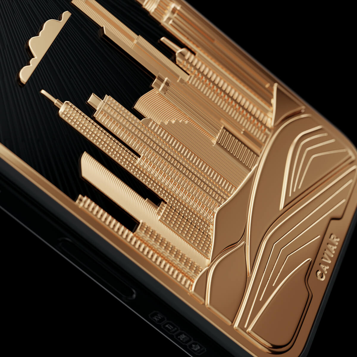 Caviar captured the grandeur of this Middle Eastern marvel on the iPhone case: a luxurious three-dimensional panorama, coated in 24-karat gold, featuring the silhouettes of the Burj Khalifa and other skyscrapers — symbols of exclusivity and grandeur. The engraving conveys the play of light and shadow, creating an effect of depth and movement.