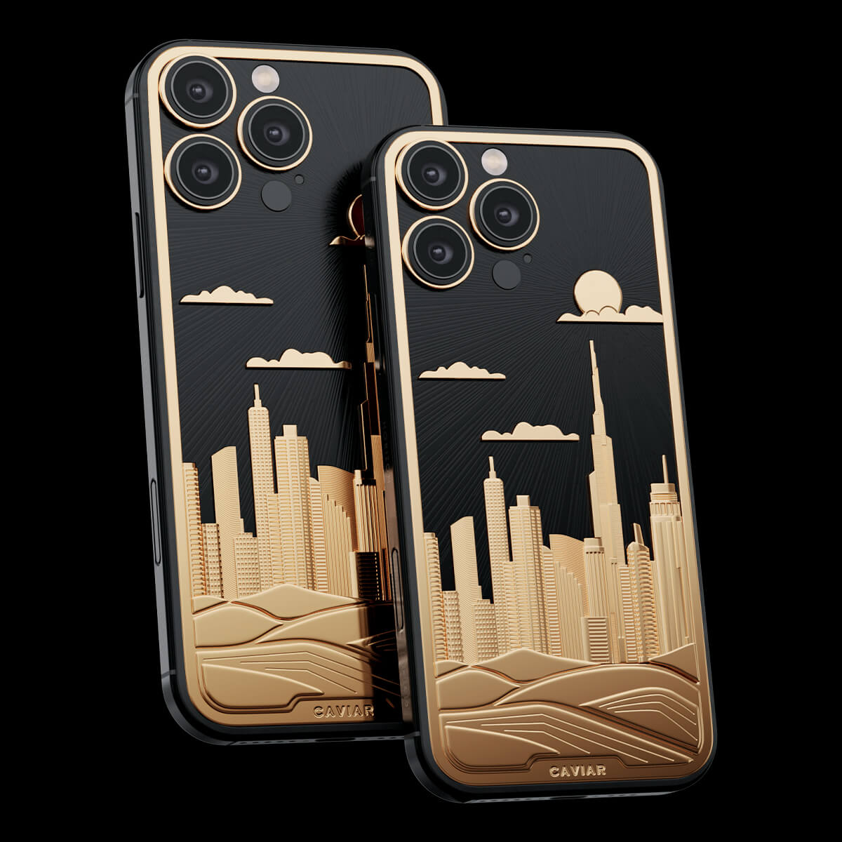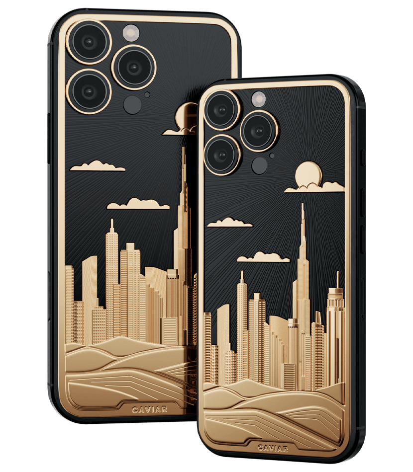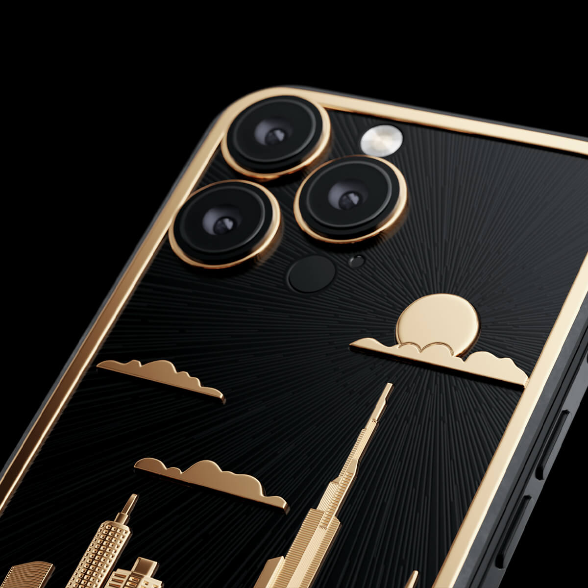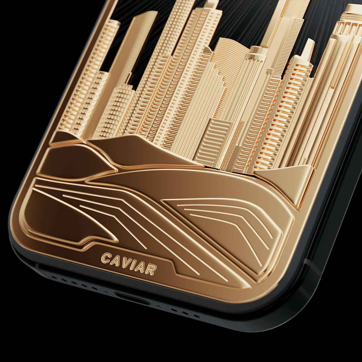 Caviar captured the grandeur of this Middle Eastern marvel on the iPhone case: a luxurious three-dimensional panorama, coated in 24-karat gold, featuring the silhouettes of the Burj Khalifa and other skyscrapers — symbols of exclusivity and grandeur. The engraving conveys the play of light and shadow, creating an effect of depth and movement.