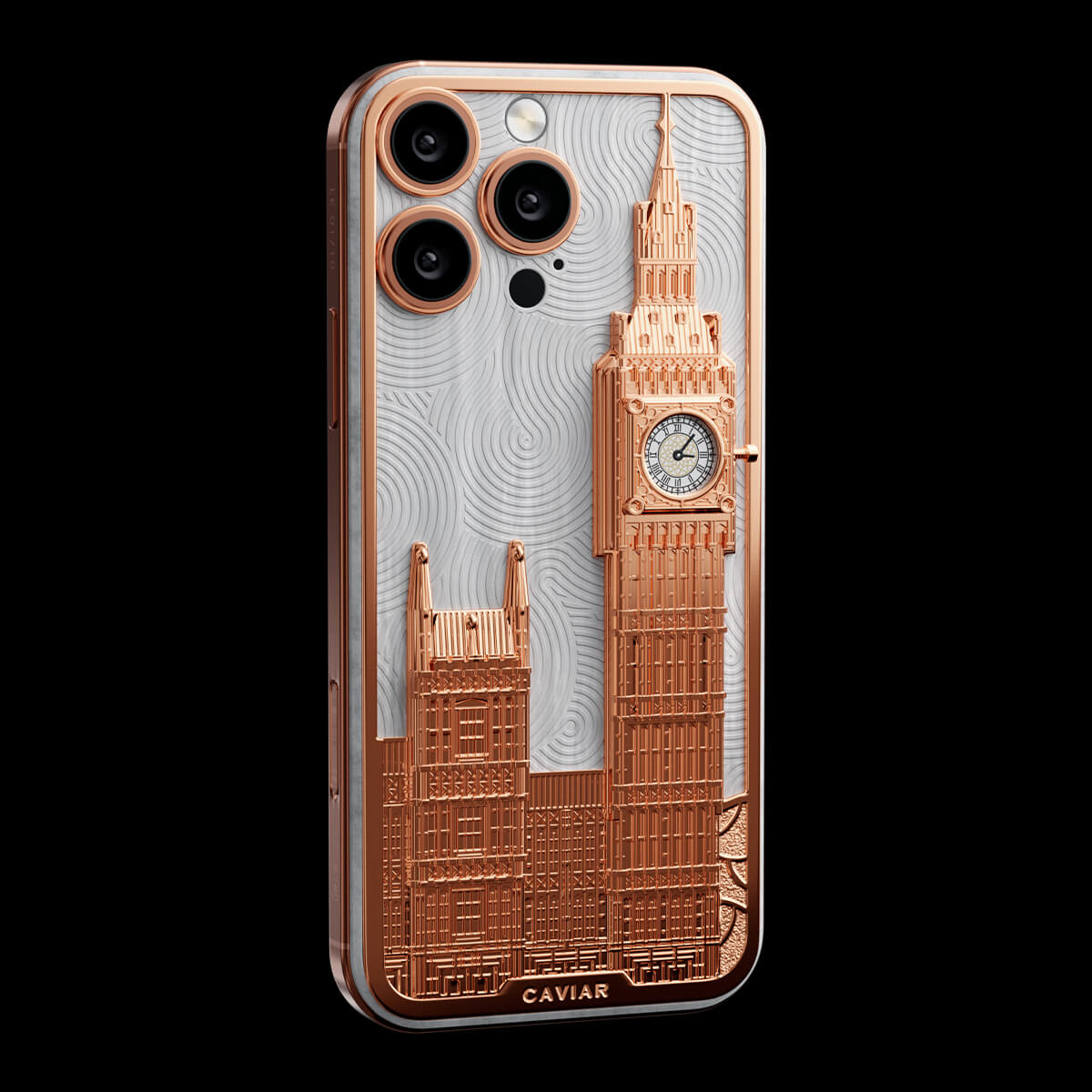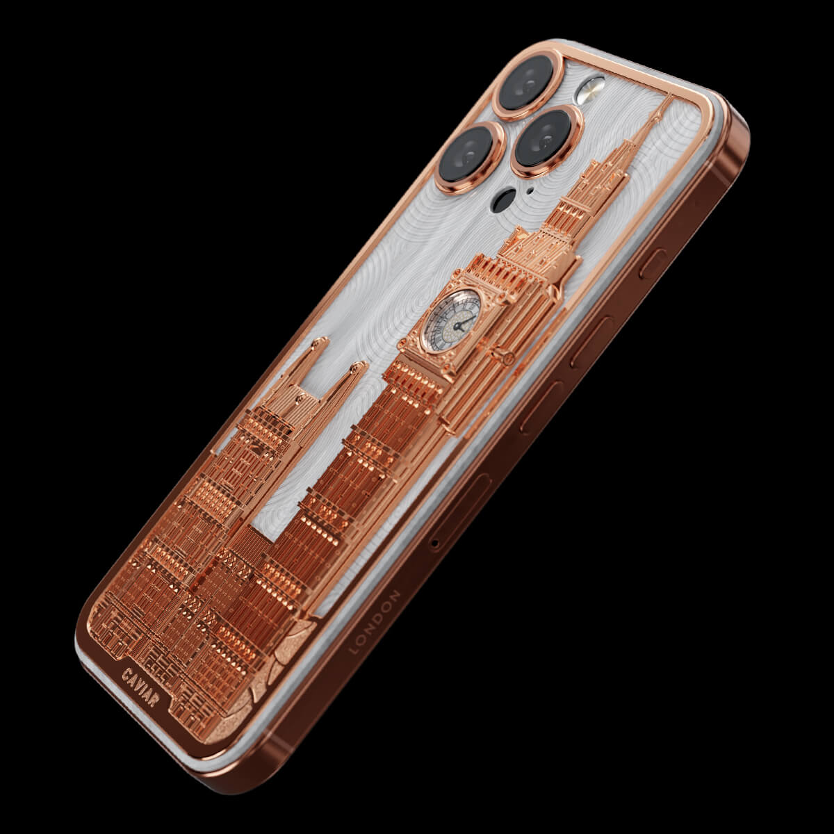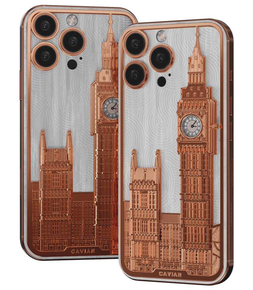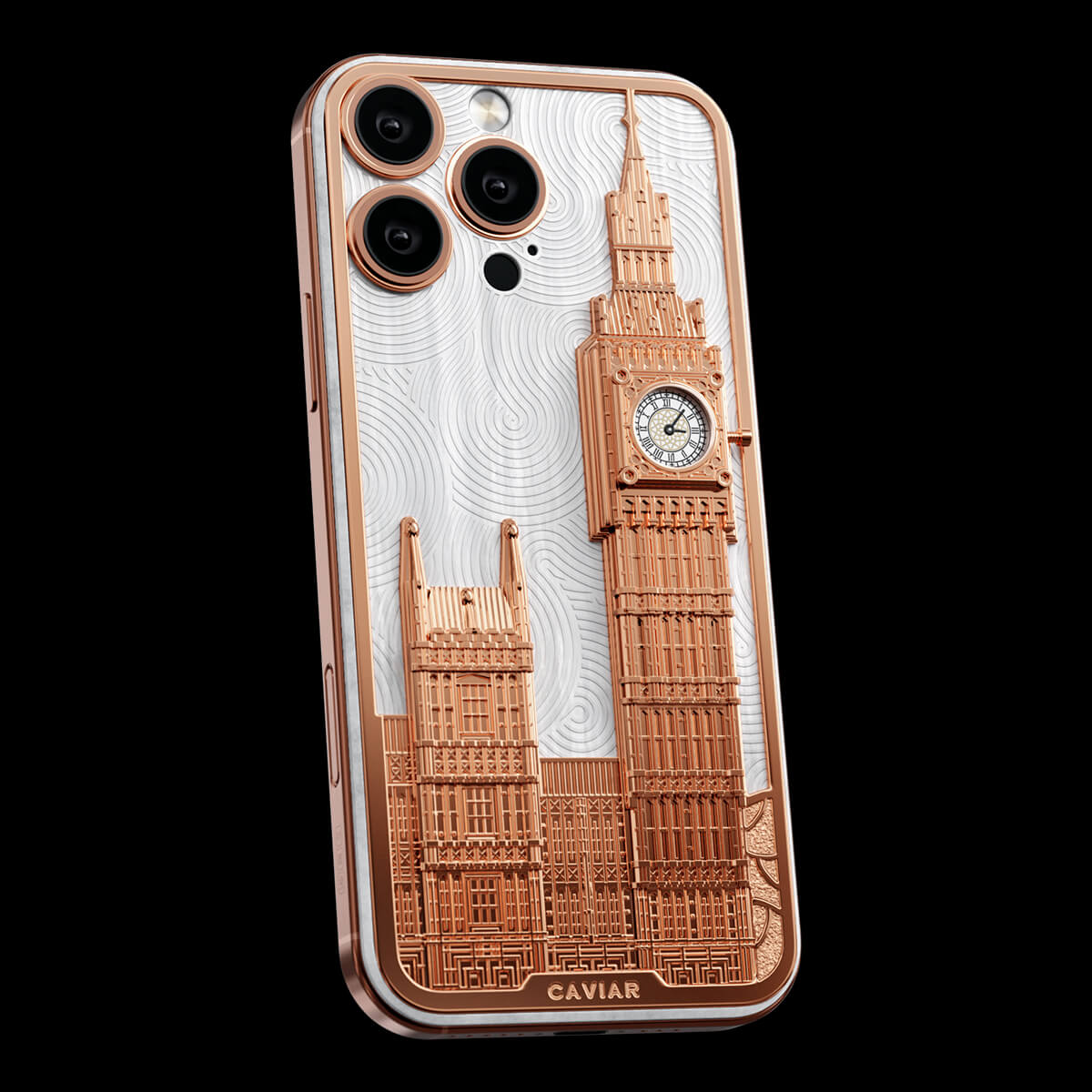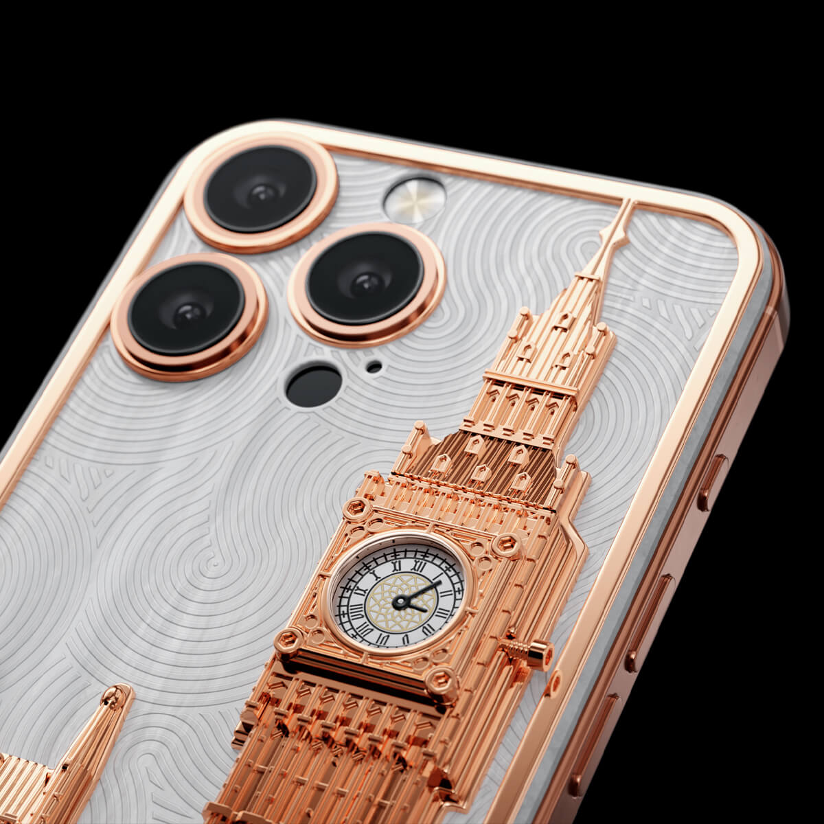 London by Caviar is your ticket to the heart of the capital. The smartphone's case is adorned with a three-dimensional depiction of the tower, coated in 24-carat gold, with a real clock mechanism pulsating at its center.