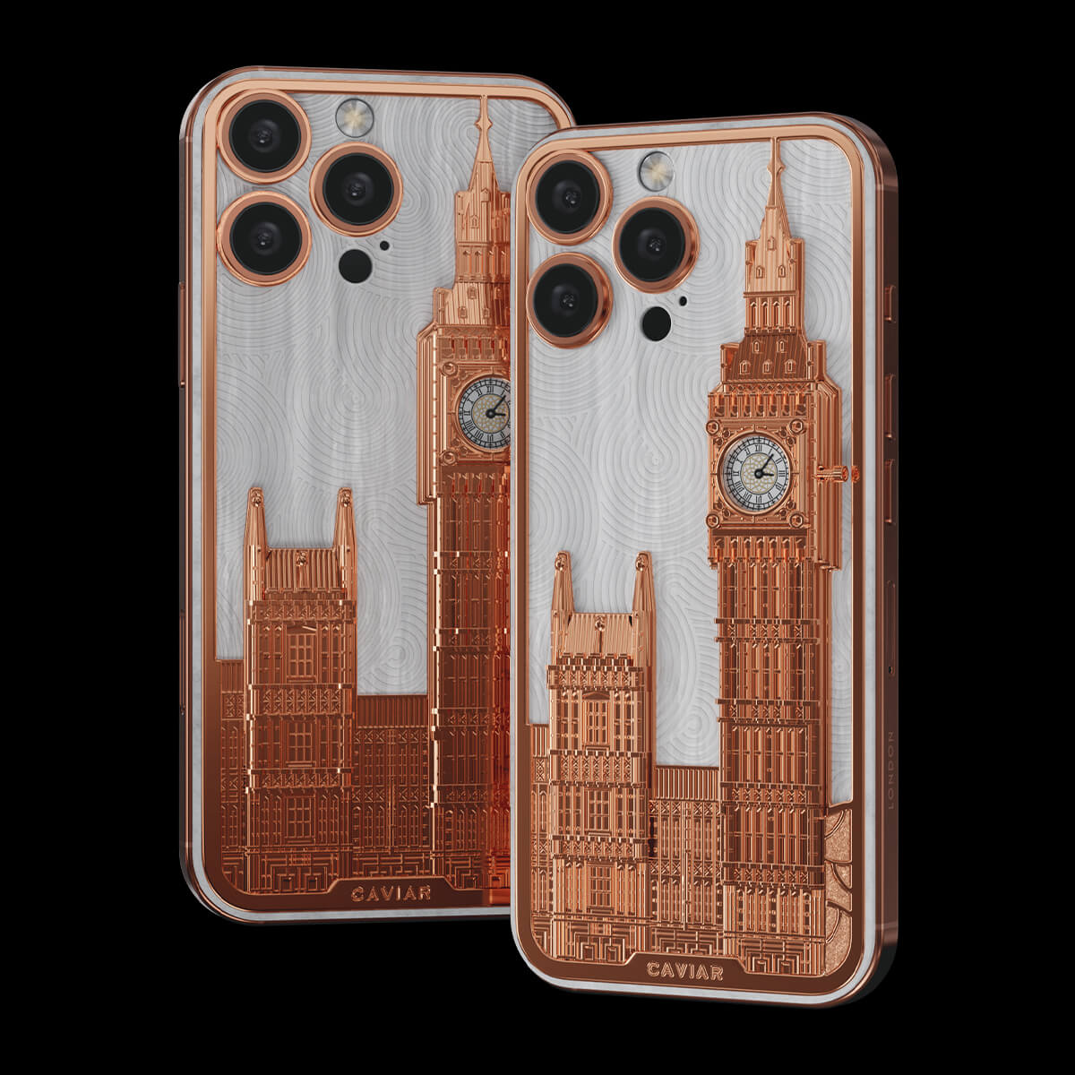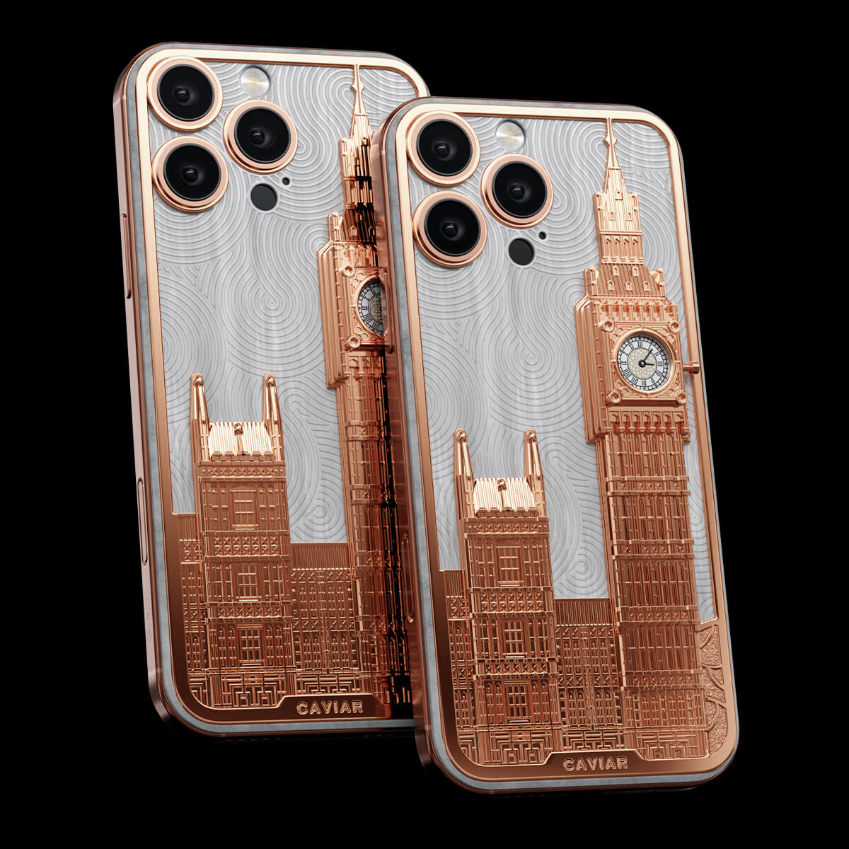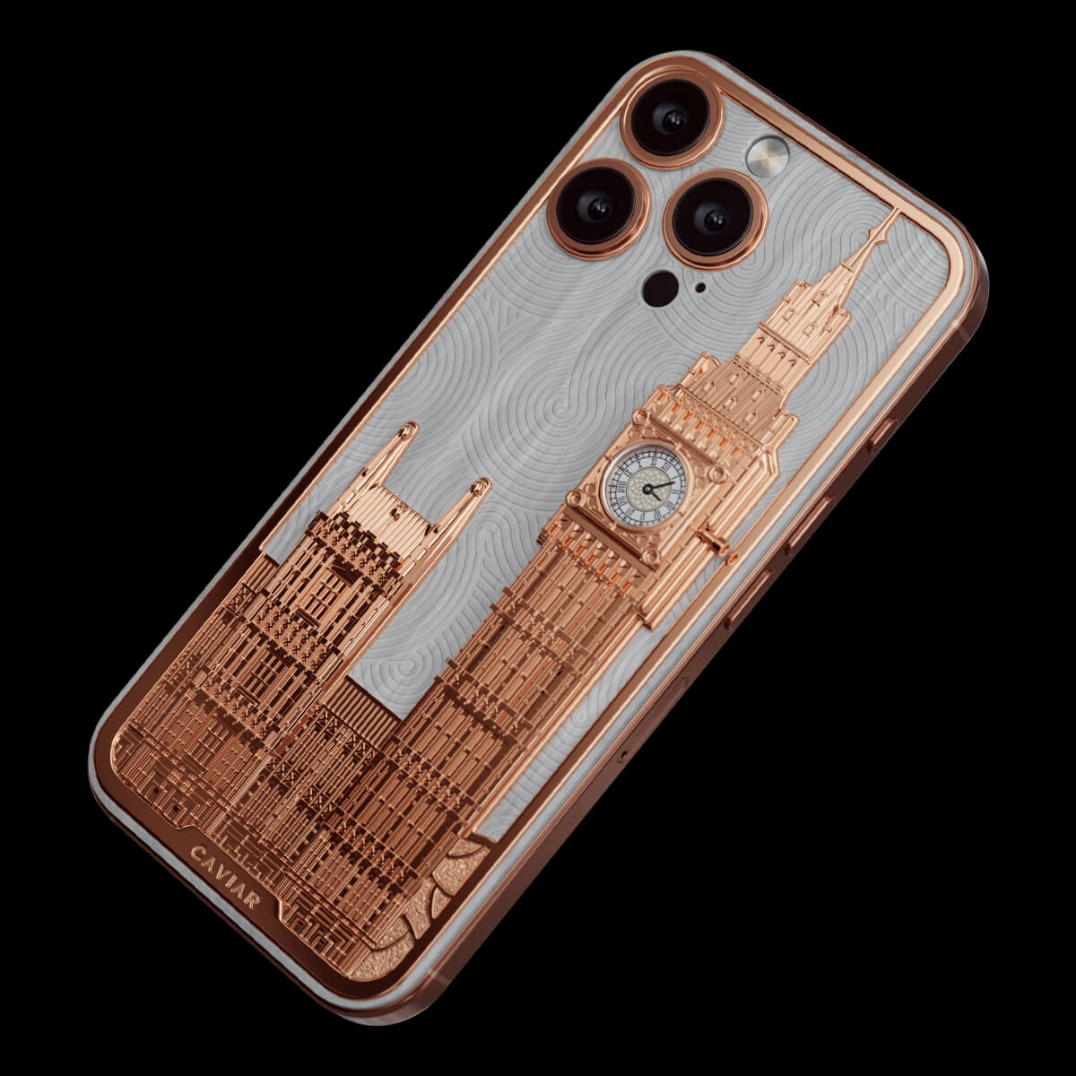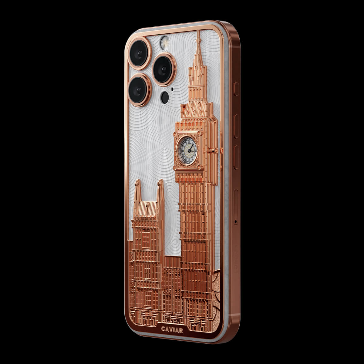 London by Caviar is your ticket to the heart of the capital. The smartphone's case is adorned with a three-dimensional depiction of the tower, coated in 24-carat gold, with a real clock mechanism pulsating at its center.