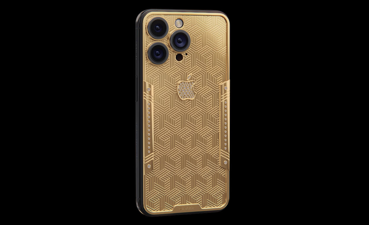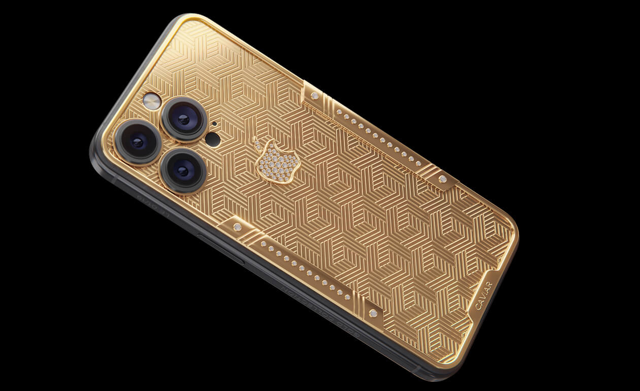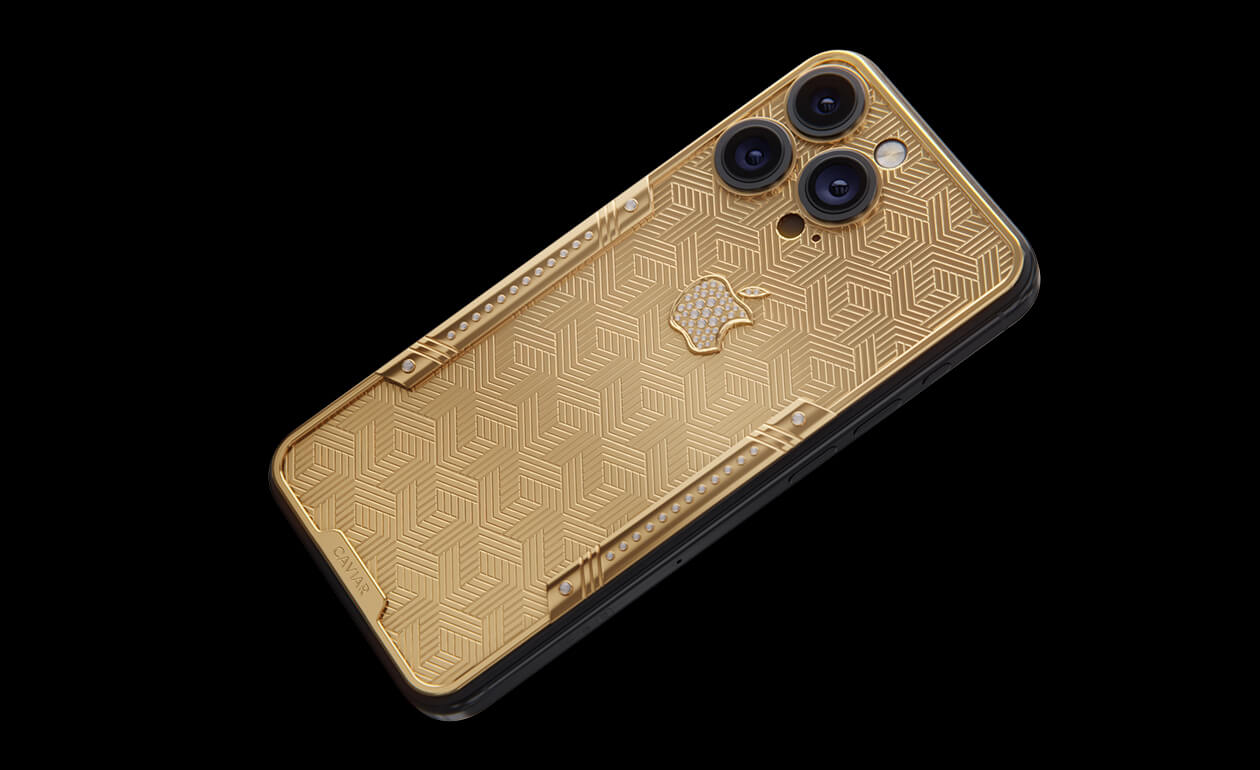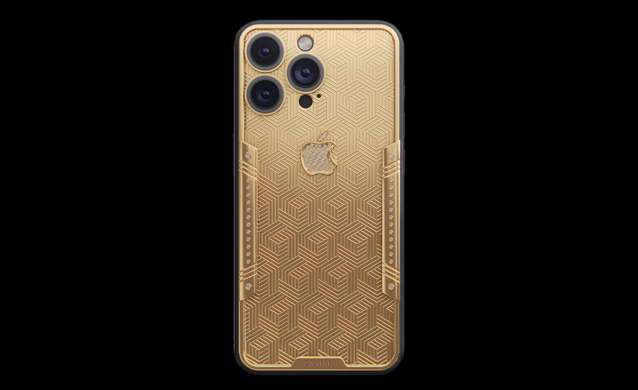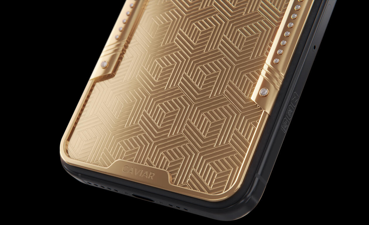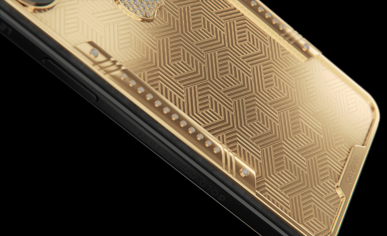 Geometry of luxury on the iPhone's body. Intertwining lines symbolizing the pursuit of perfection. Caviar's masters enhanced the golden splendor with a scattering of crystals. At the center lies a precious apple made of crystal mosaic.