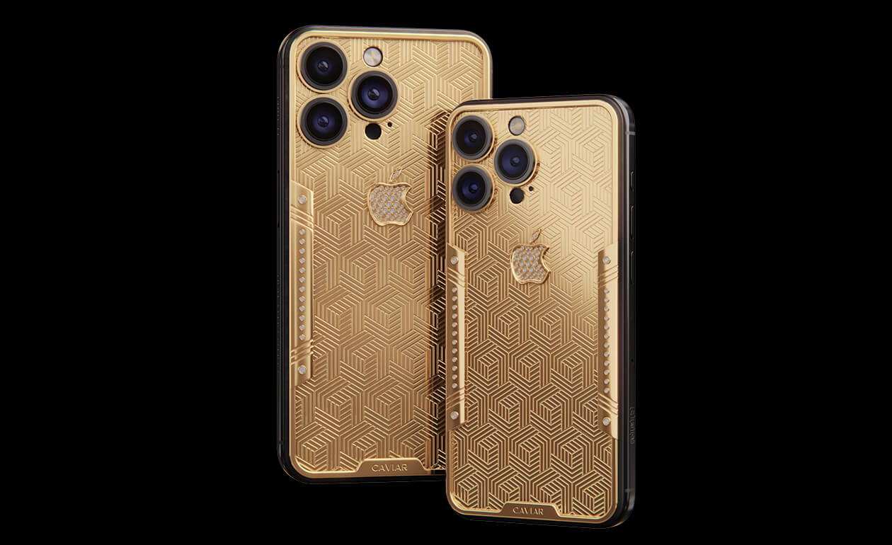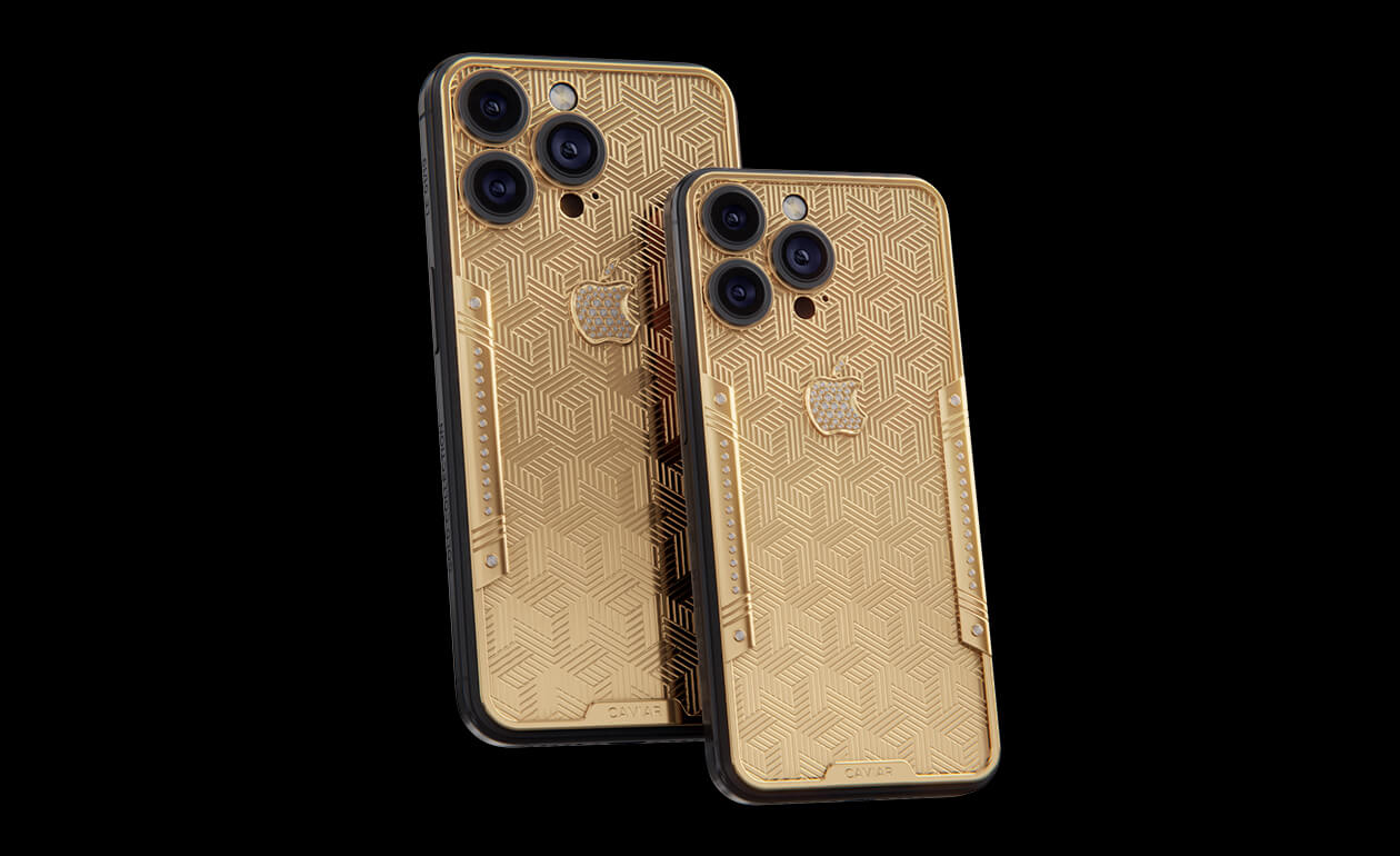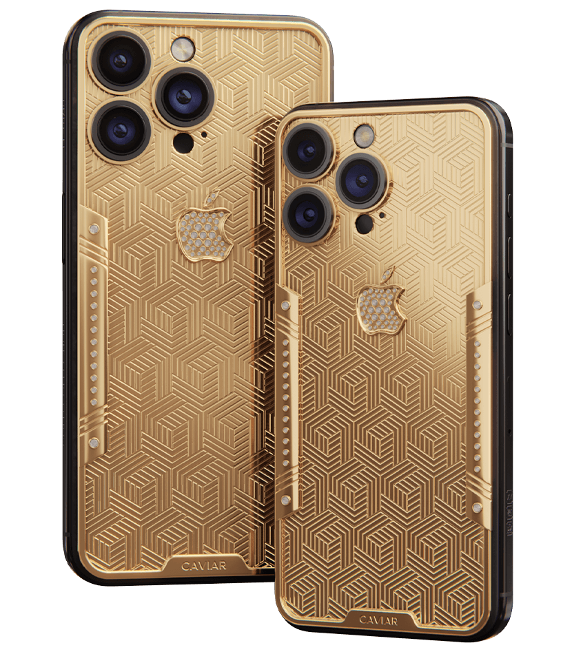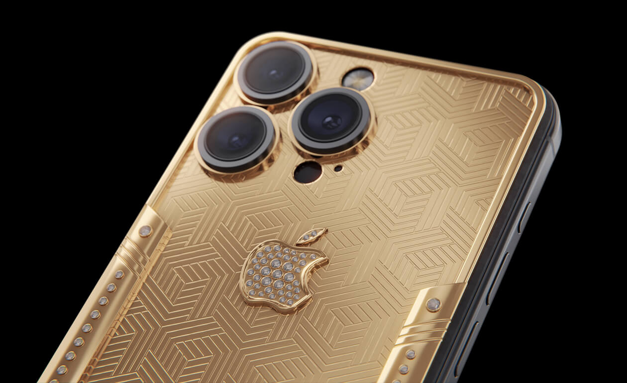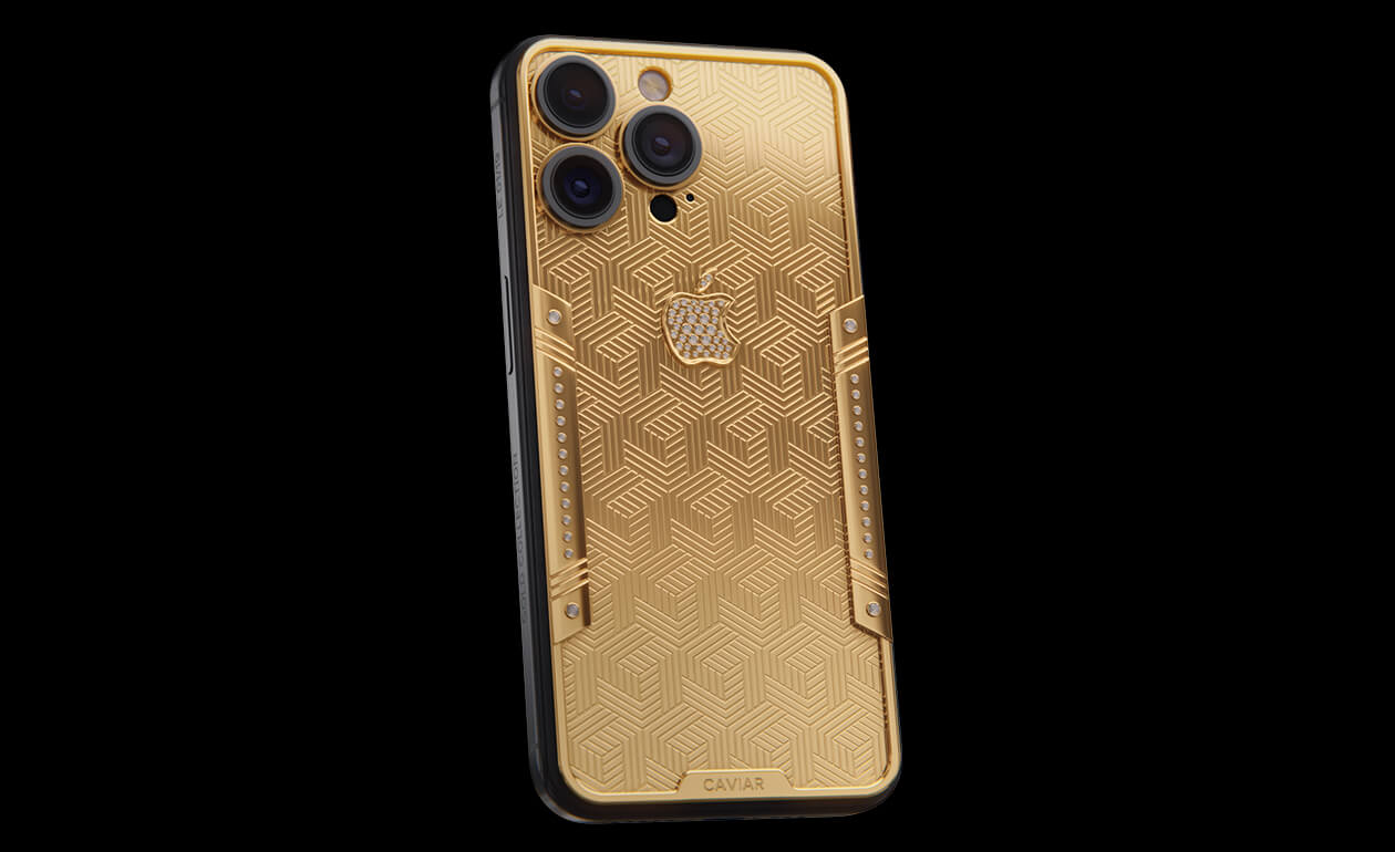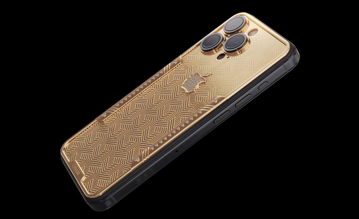 Geometry of luxury on the iPhone's body. Intertwining lines symbolizing the pursuit of perfection. Caviar's masters enhanced the golden splendor with a scattering of crystals. At the center lies a precious apple made of crystal mosaic.