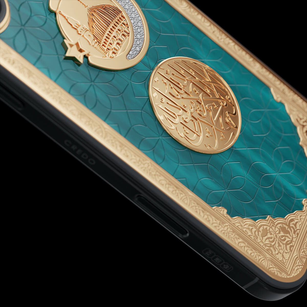 The centerpiece of the design is a detailed 3D insert depicting the Prophet’s Mosque, covered in 24-karat gold and crowned with a crescent moon symbol. Below it lies a golden plaque featuring the Shahada — the Islamic declaration of faith.