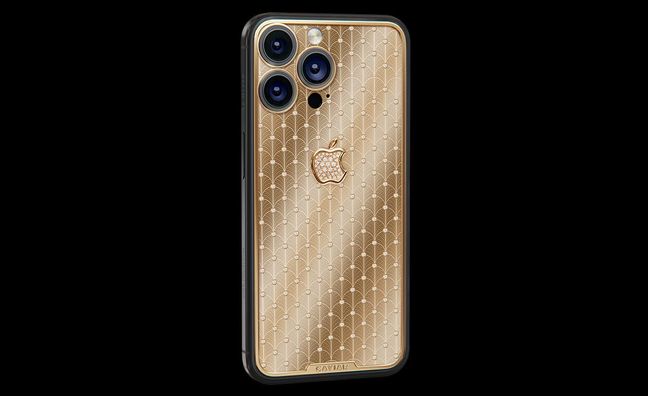 Tropical Art Deco patterns on the iPhone case. Elegant design, echoing the art of the modernist era. Palm leaves adorned the rich interiors of the aristocracy of the past century. Caviar covered the device's gold case with a magnificent ornament. Caviar's craftsmen complemented the golden splendor with a scattering of diamonds. In the center is a precious apple made of crystal mosaic.