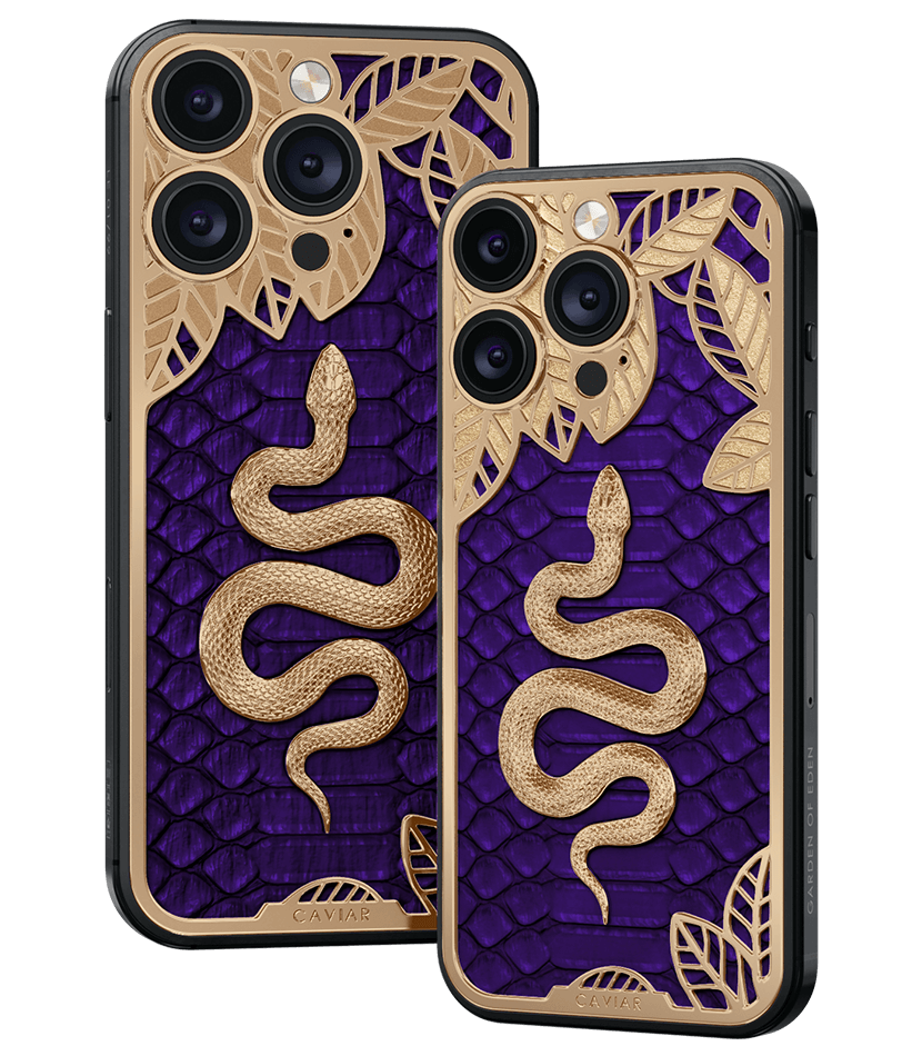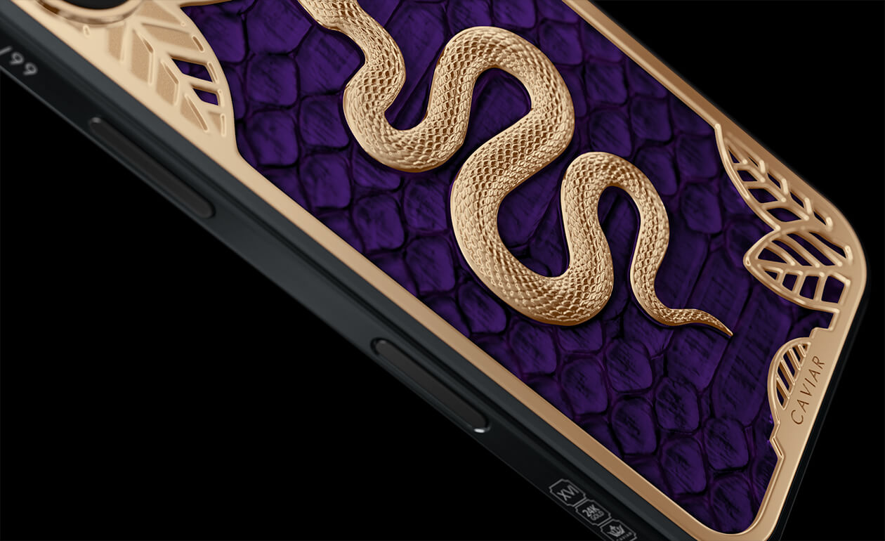 The elegant snake by Caviar is covered with the purest 24K gold. In contrast to the purple skin of the python, it seems that it sparkles, nestled among the gilded leaves of the Garden of Eden.