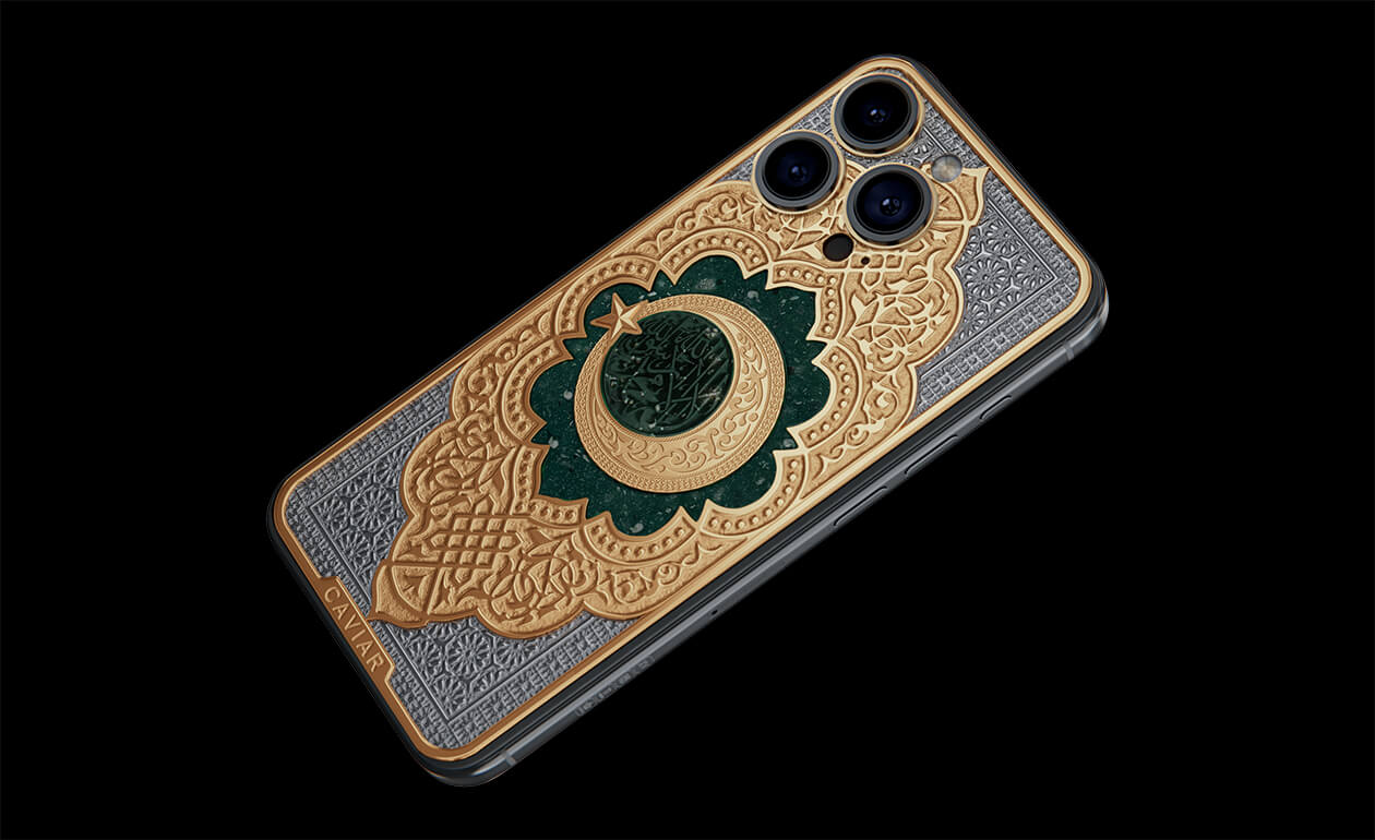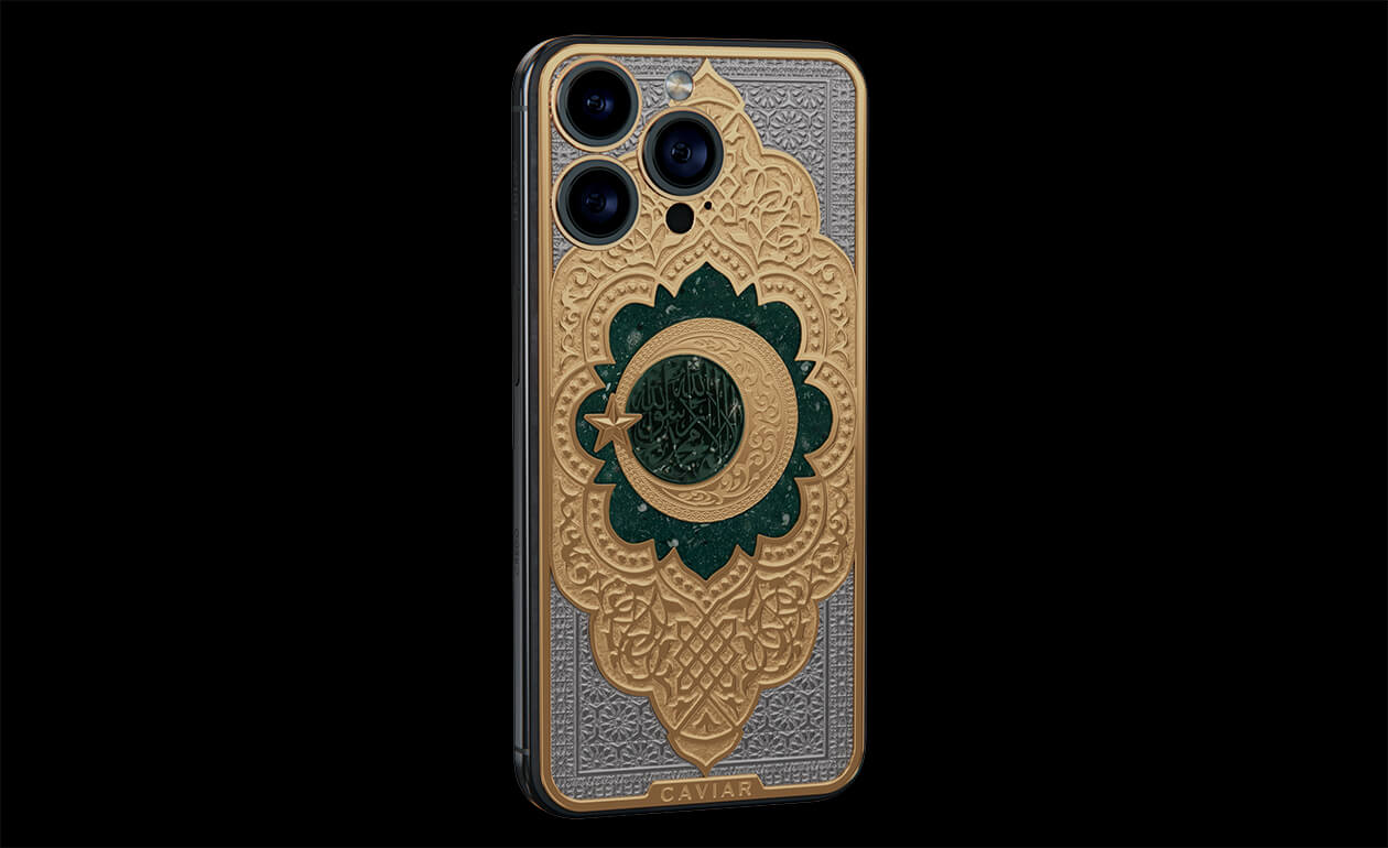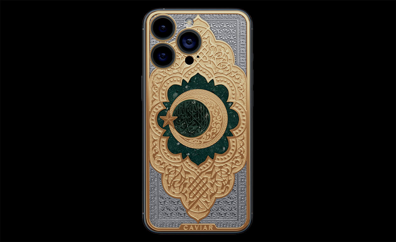 This luxurious custom iPhone 15 Pro is adorned with a three-dimensional panel covered in 24-karat gold, inspired by the Muslim architecture of the classical mosques of Mecca, Damascus, and Medina.