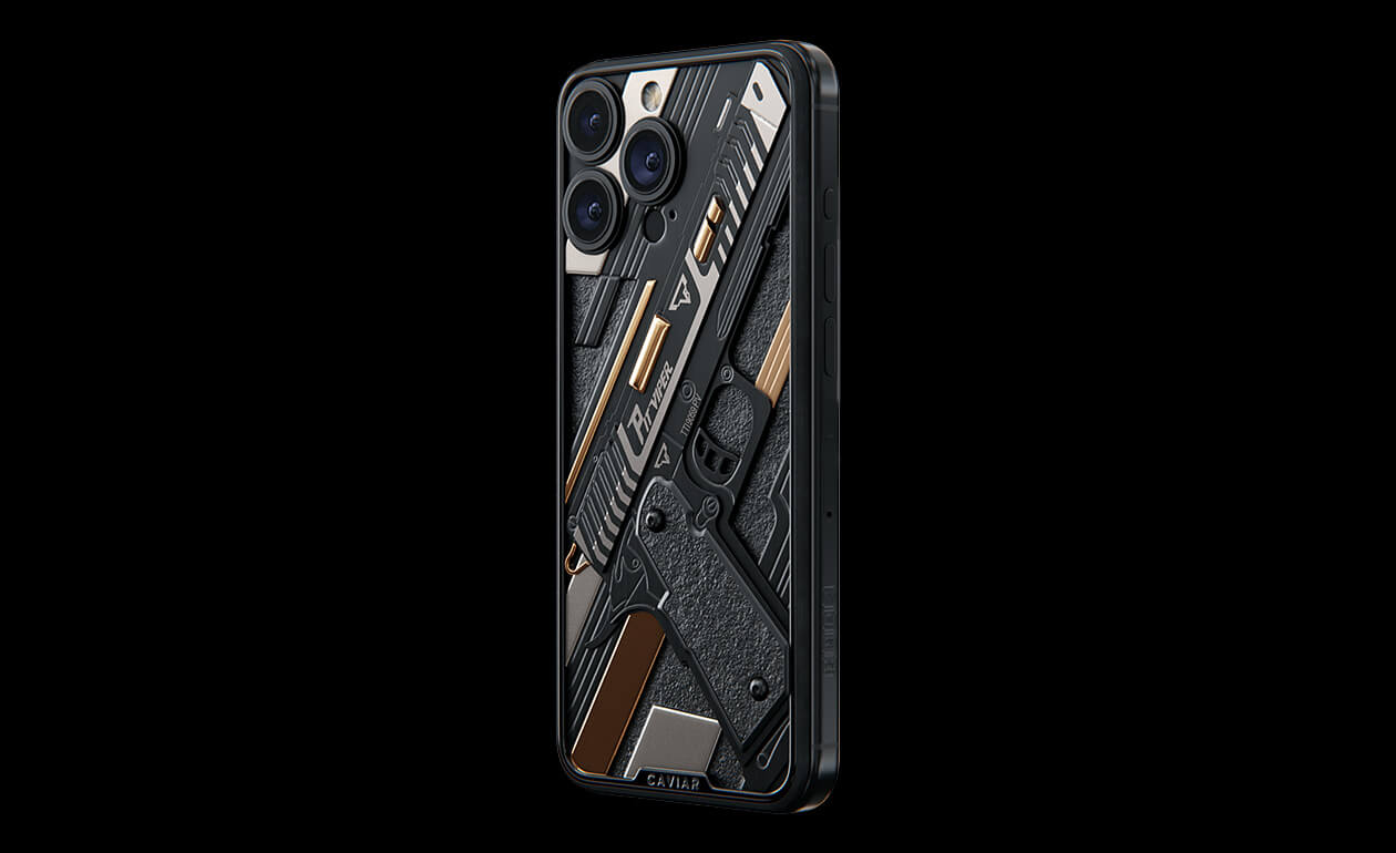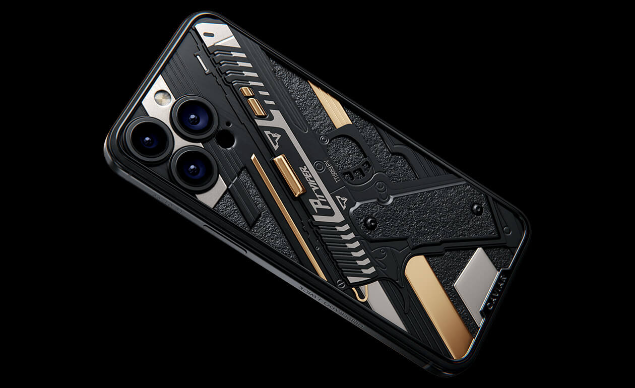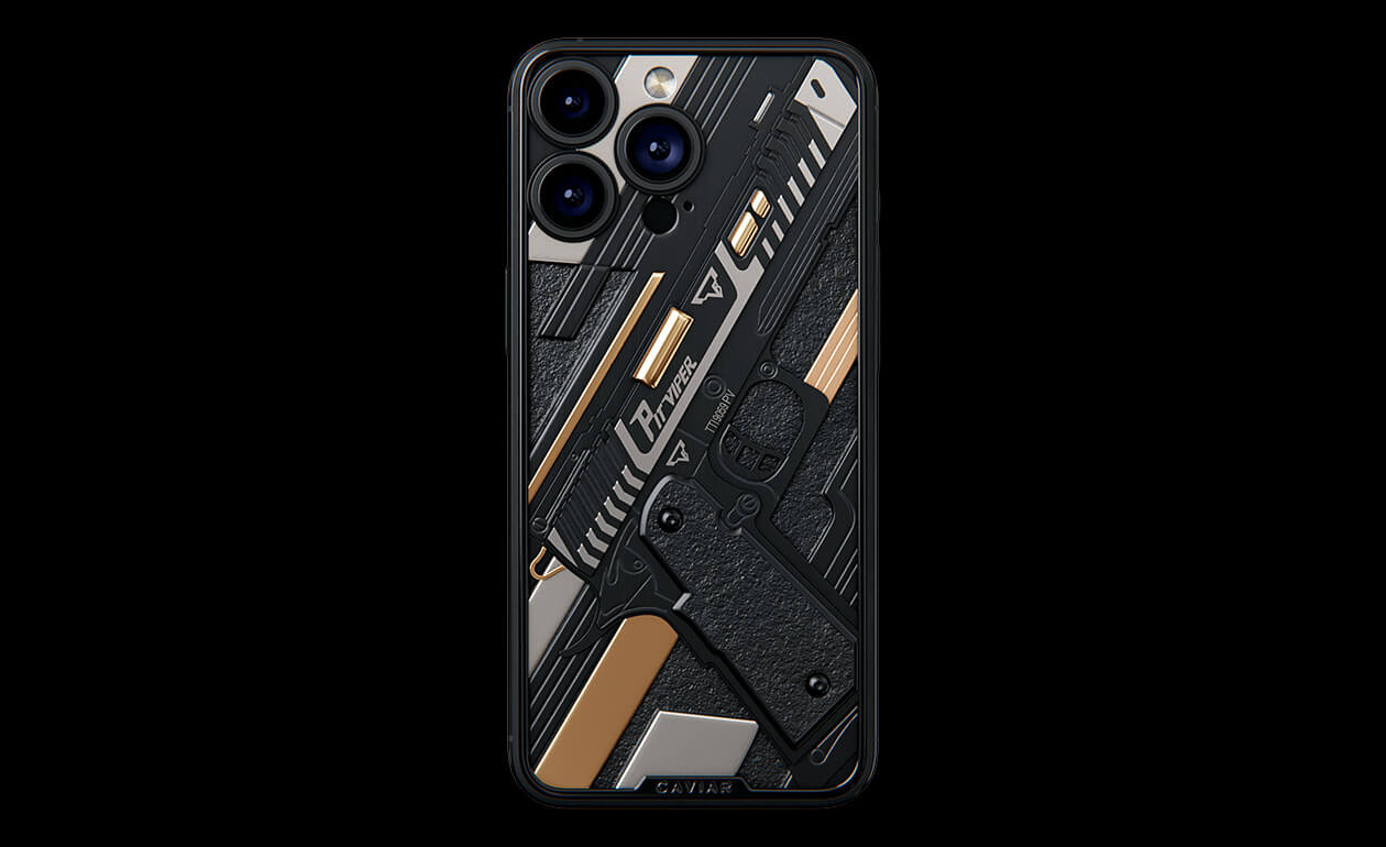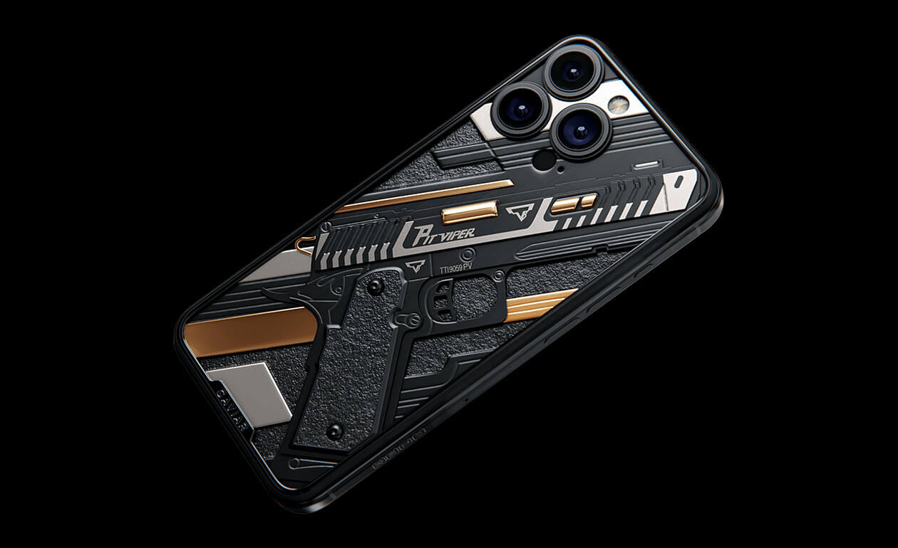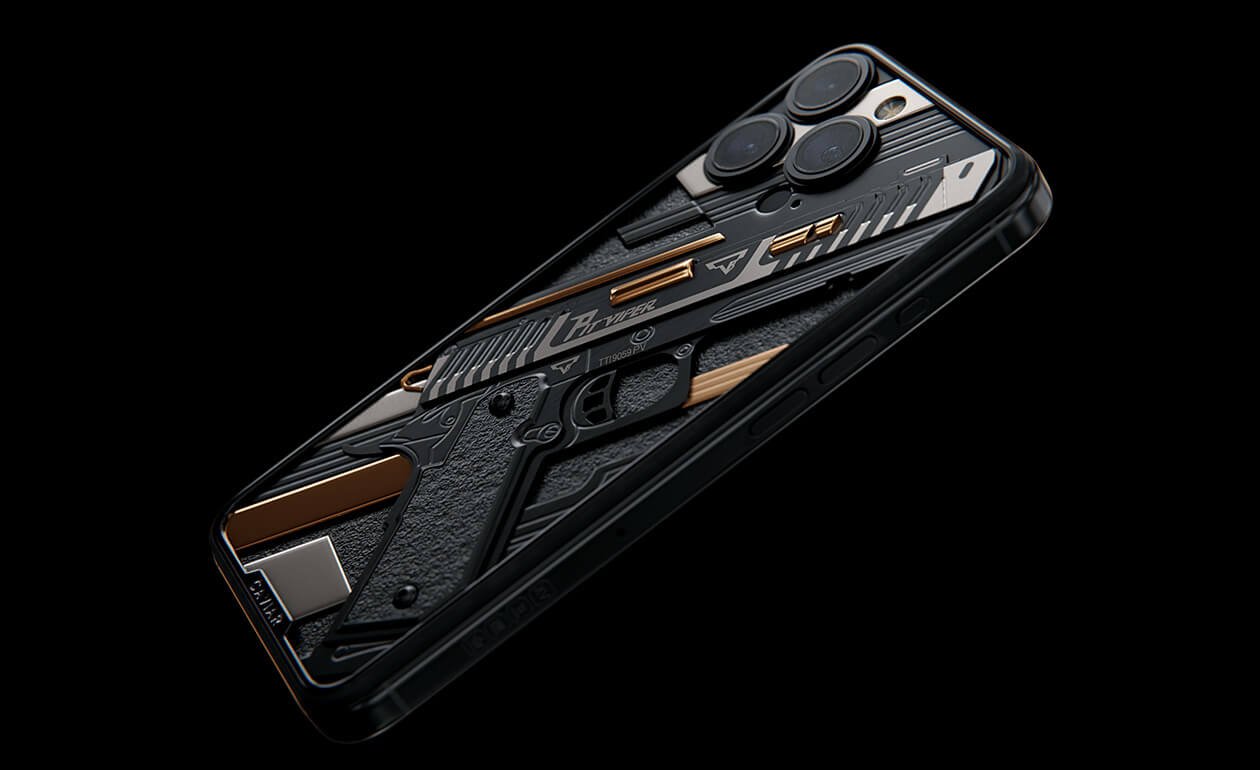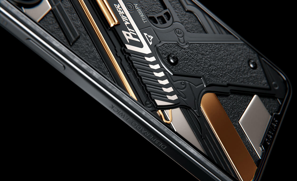 Introducing the iPhone 16 Pro Viper, showcasing John Wick's formidable weaponry. The design of this custom device embodies the style and precision of the professional assassin. Every detail is crafted from luxurious materials to convey the atmosphere of the iconic action movie. The titanium parts of the gun are coated with PVD, just like in the finest Swiss watches, and some elements are adorned with 24K gold.