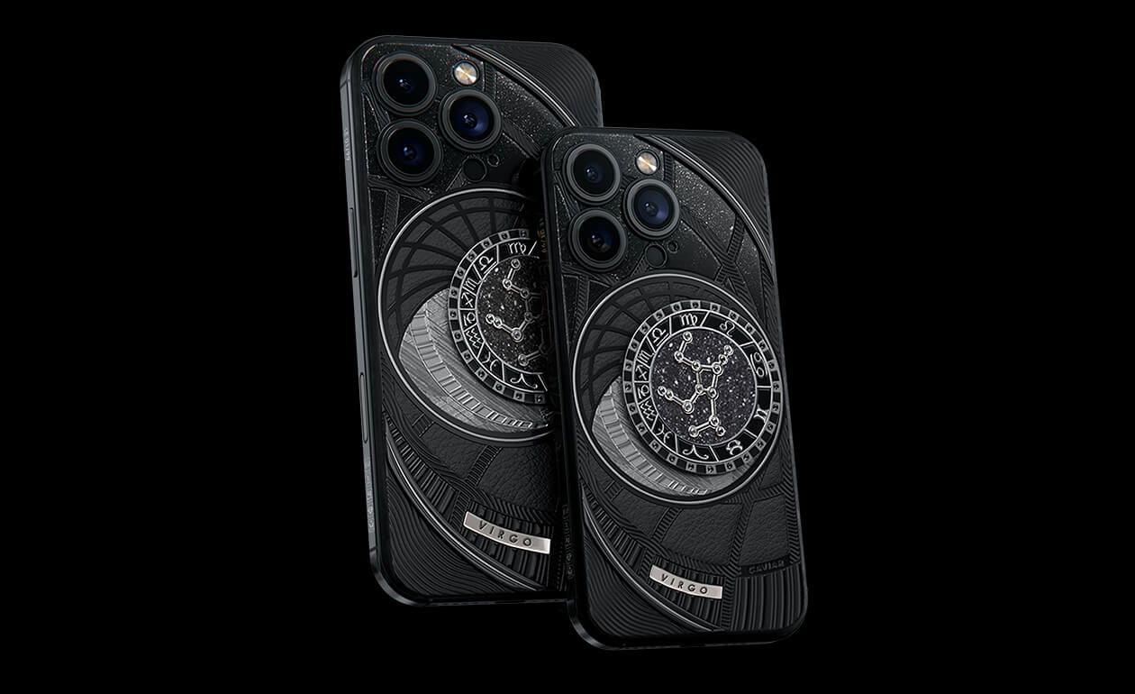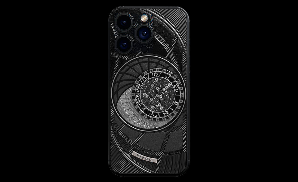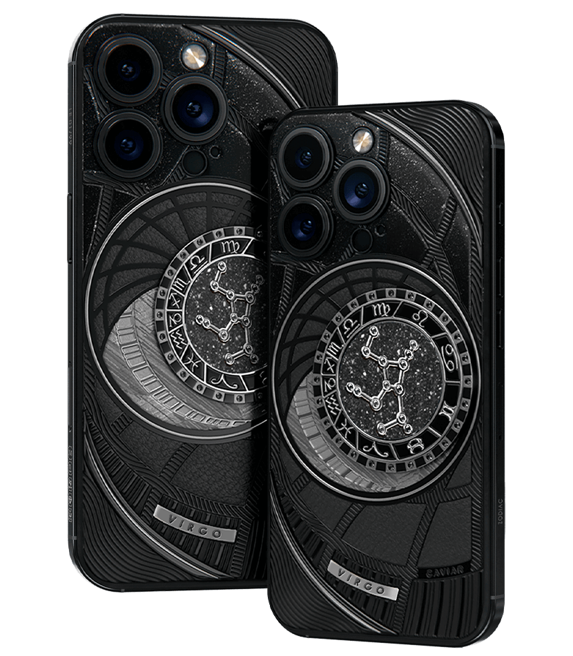 Virgoes, today we present to you Virgo. Your smartphone has a sky vault with your lucky stars on it. This is a panel of 24 zirconia, created on titanium with a PVD coating. We highlighted the crystal shine a black composite and finished the composition with a meteorite fragment on classic black calf leather.