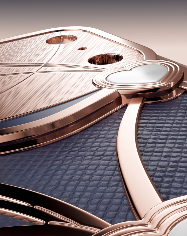 Inspired by the lightness and sensuality of fine jewelry heart motifs, the design features interlacing gold-plated lines that create a sense of fluidity and rhythm, as if the hearts are floating in a graceful dance. The deep blue genuine leather is accented with matching blue inlays framed in gold, adding depth and elegance to the composition.