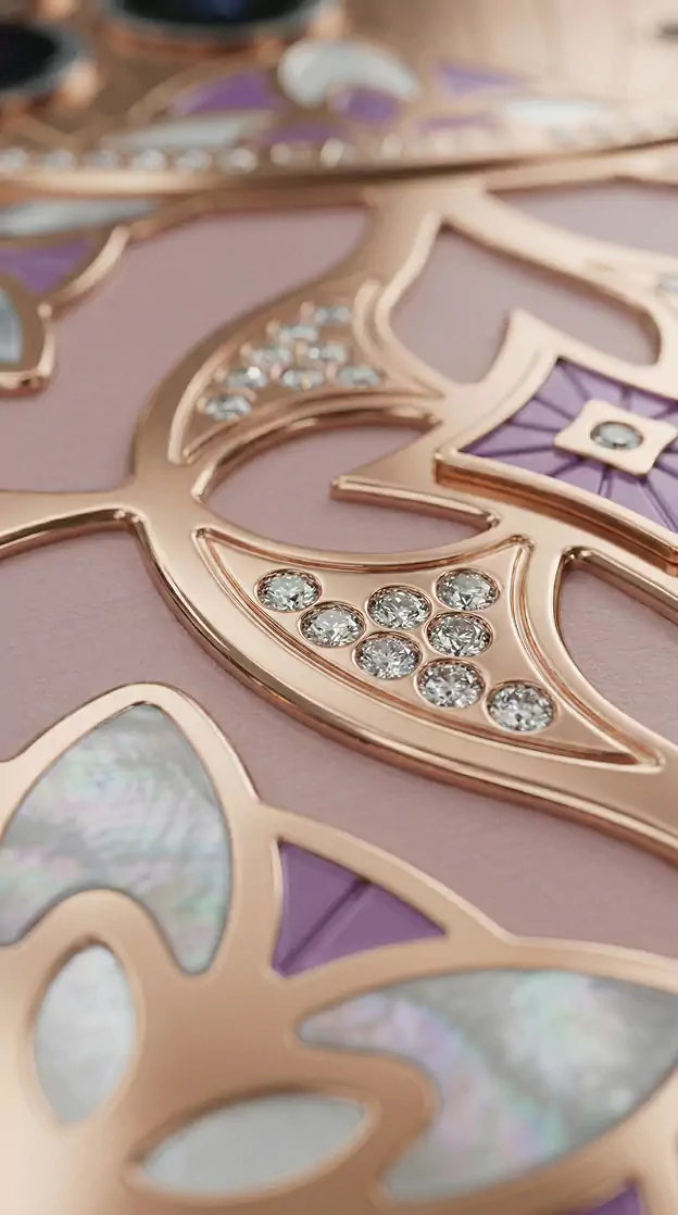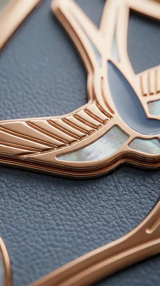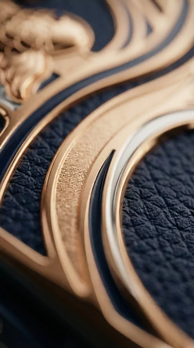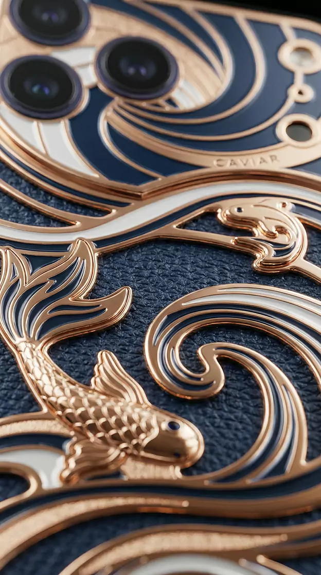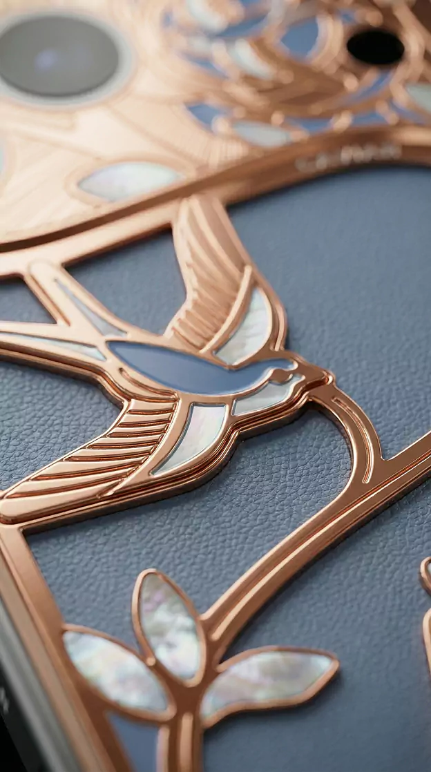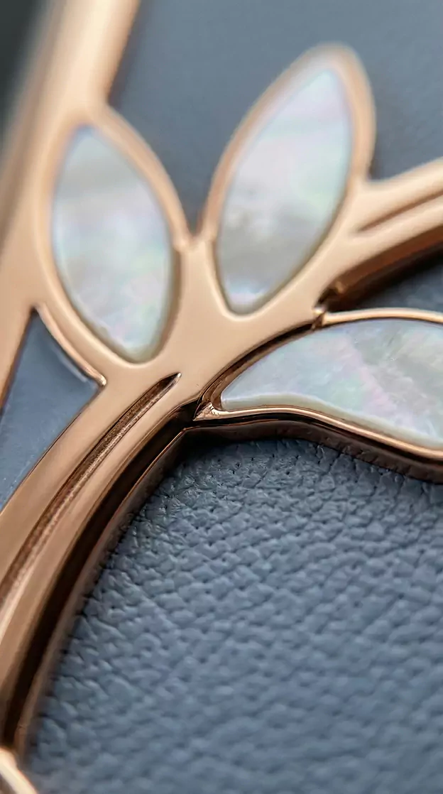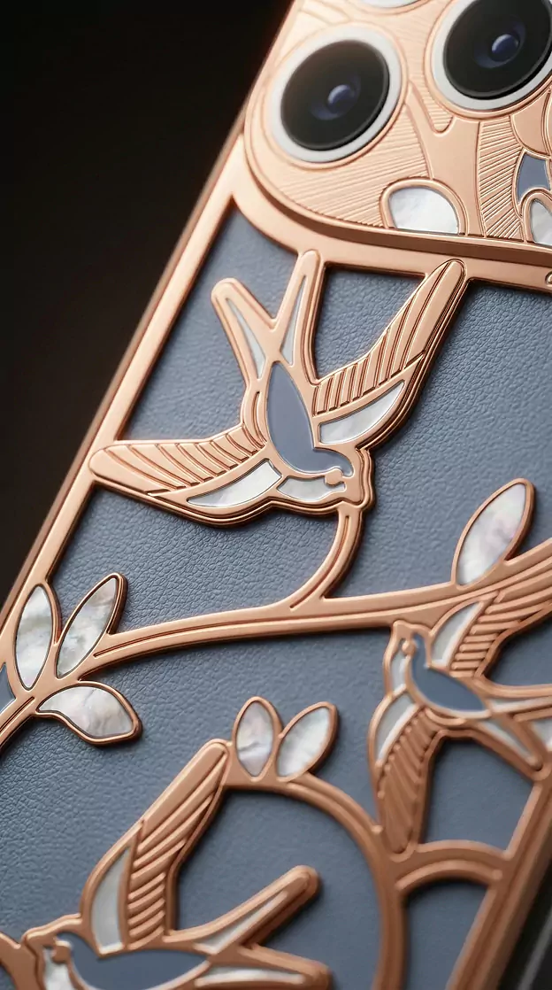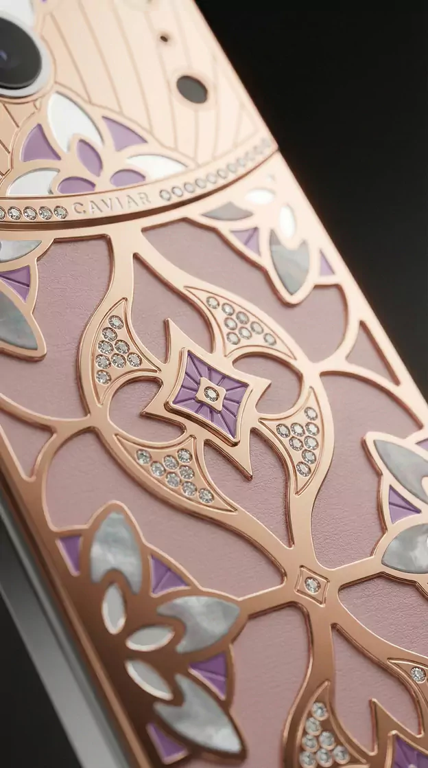 Charming Lotus – a model inspired by Eastern wedding symbolism. Across cultures from India to China, the lotus represents pure love, fertility, and marital harmony. In China, a pattern of two lotus flowers on a single stem symbolizes a perfect union. The smartphone design echoes the aesthetics of Art Nouveau enamel florals and traditional Eastern wedding textiles.