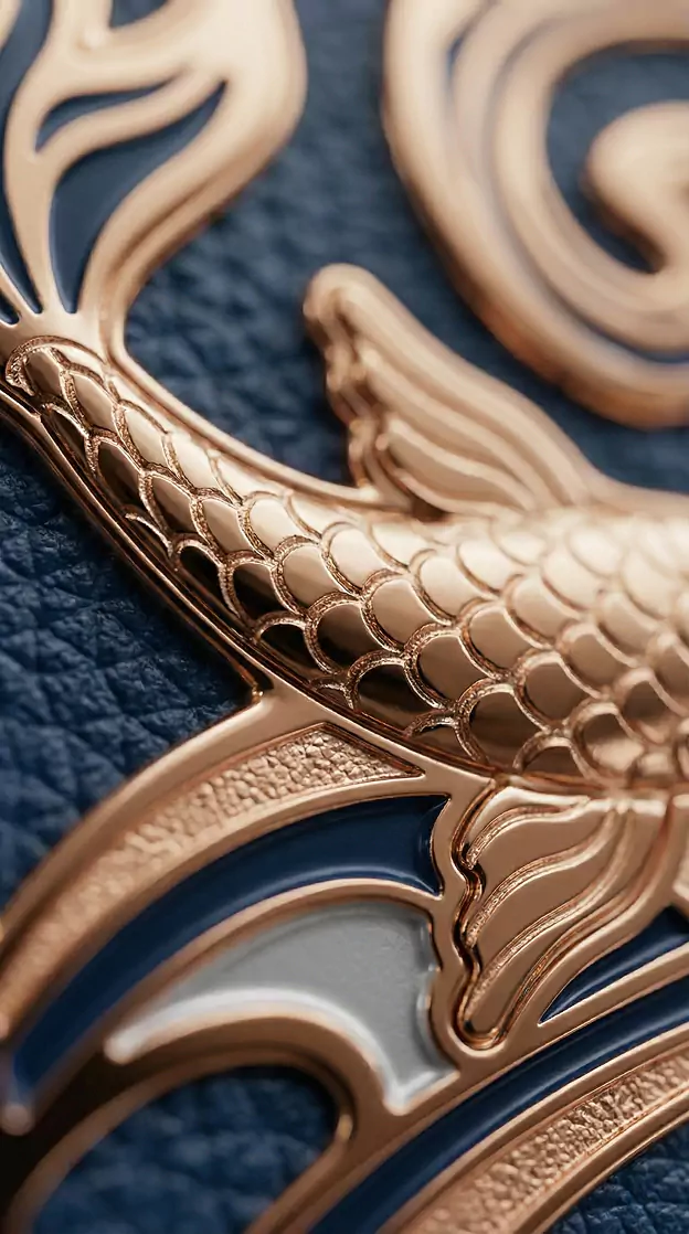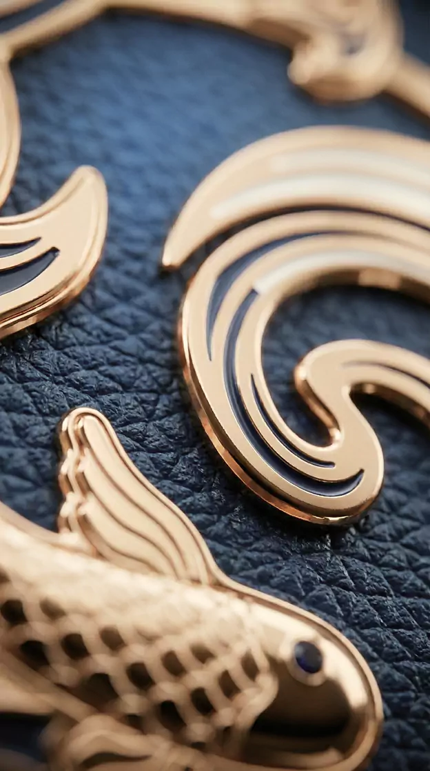 Goldfish – featuring a pair of golden fish, an ancient symbol of happy marriage, prosperity, and abundance. In Chinese culture, goldfish with lotus motifs decorated wedding porcelain, fabrics, and embroidery, while in Europe a fish was gifted on anniversaries as a sign of good fortune. The model showcases a golden pair of fish in circular motion, symbolizing the continuity of love. The sculptural fish elements are gold-plated and adorned with sapphires.